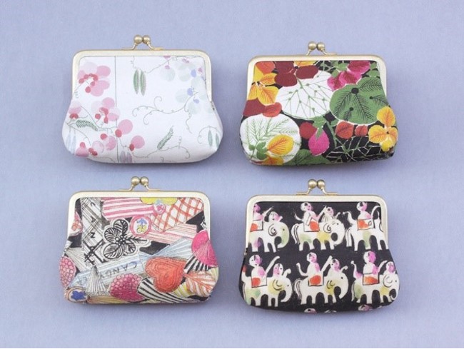 国産口金を使った、がまぐち(小物入れ)です。開いた時も楽しめるよう、作品にあわせて、それぞれ異なる色の裏地を使って仕立てました。