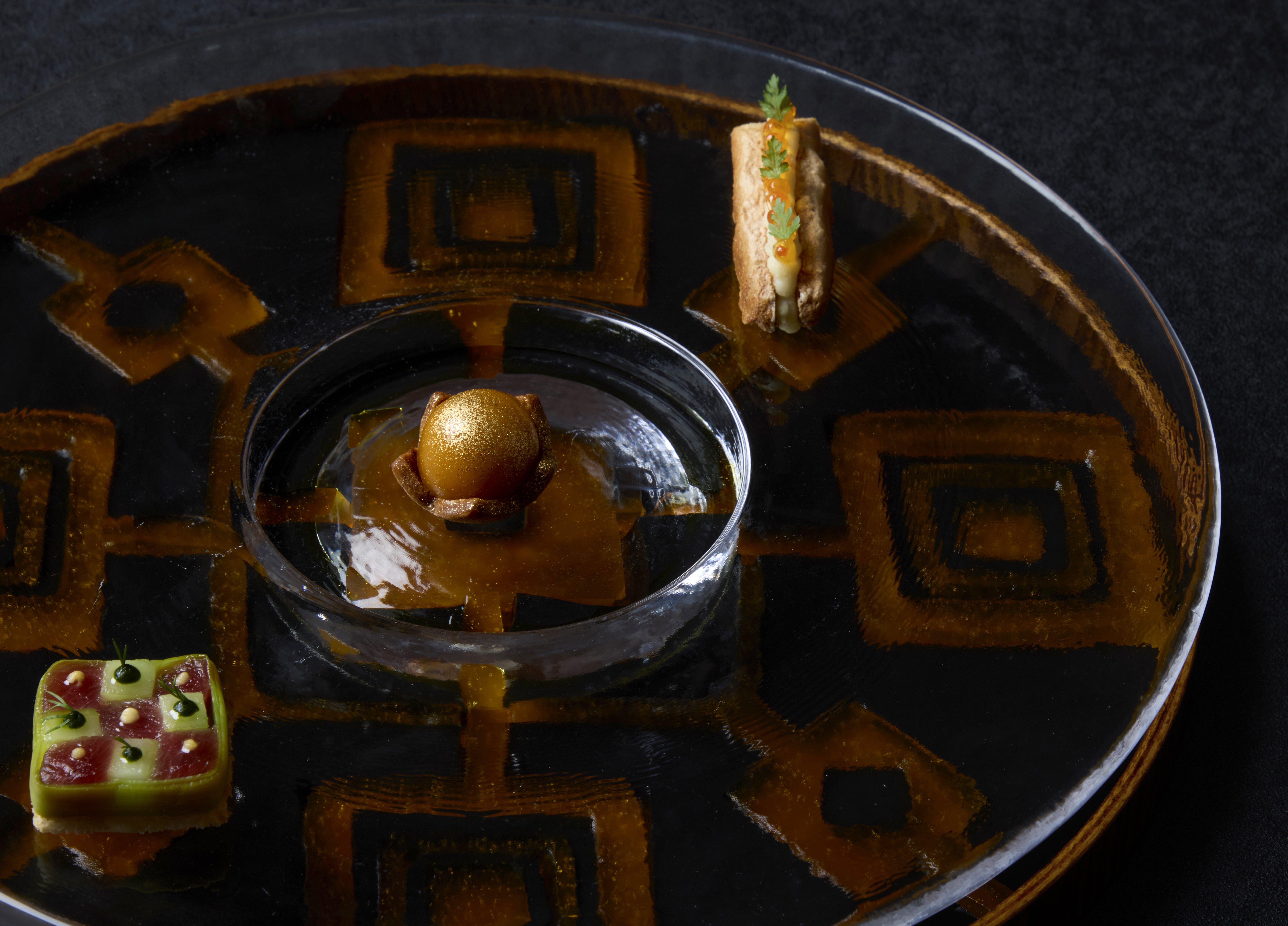 幾何学模様に浮かび上がる、フランス料理の粋を凝縮した3品