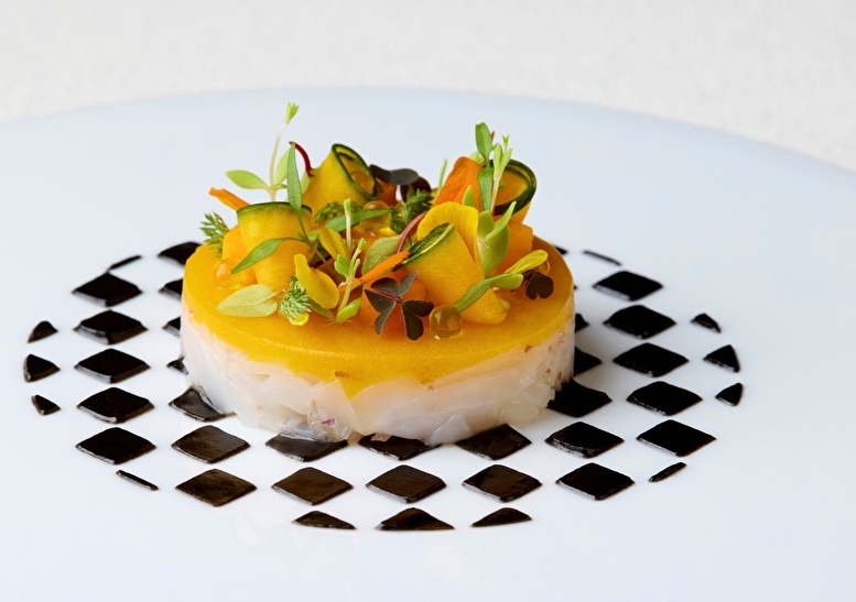 ライムの香りをまとわせた烏賊のタルタルに、バターナッツ南瓜と鰹節を合わせた奥行きある味わいを添えて。シャープな市松模様と、鮮やかなオレンジ色のコントラストが、アール・デコの装飾性と現代的な女性像を想起させます。