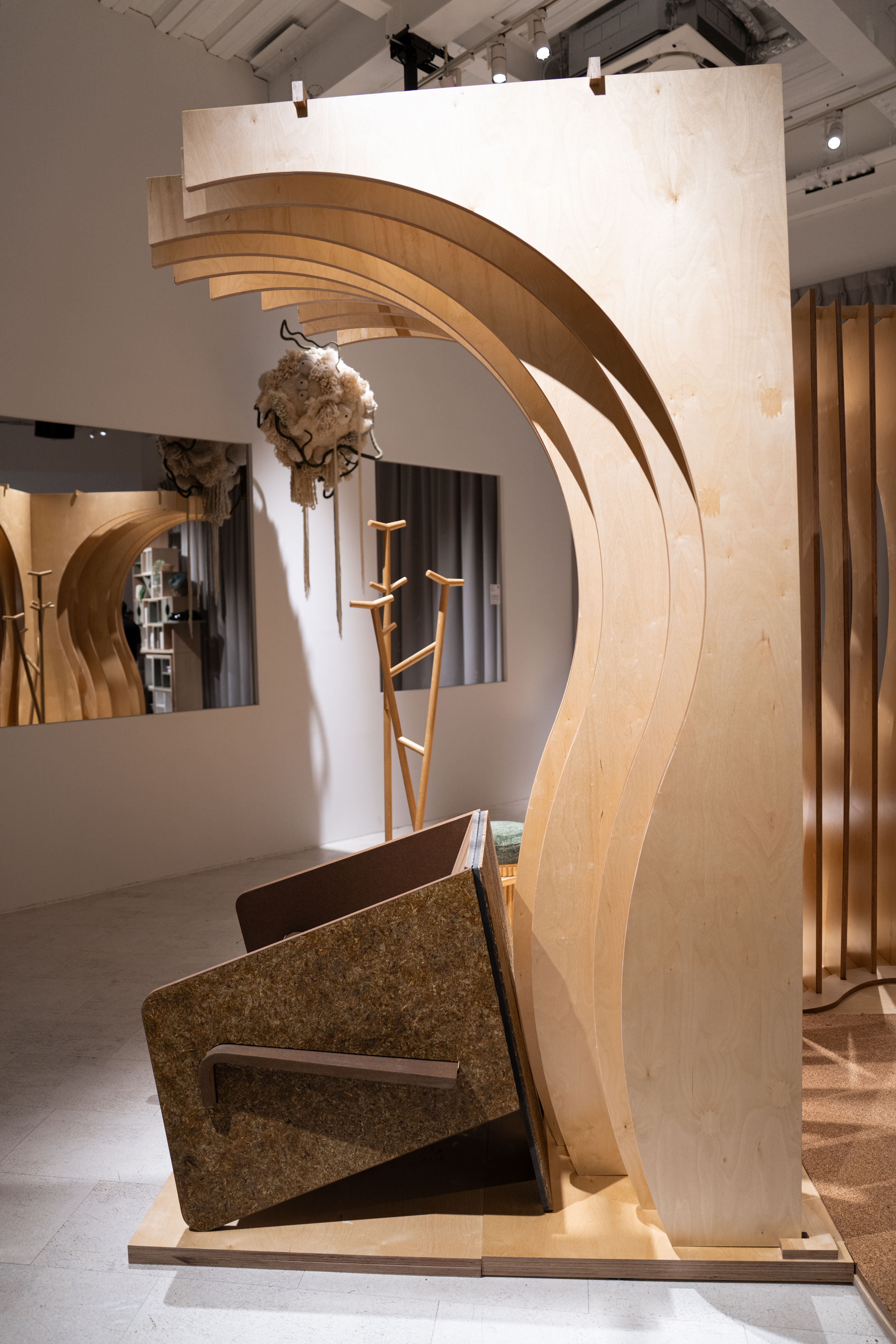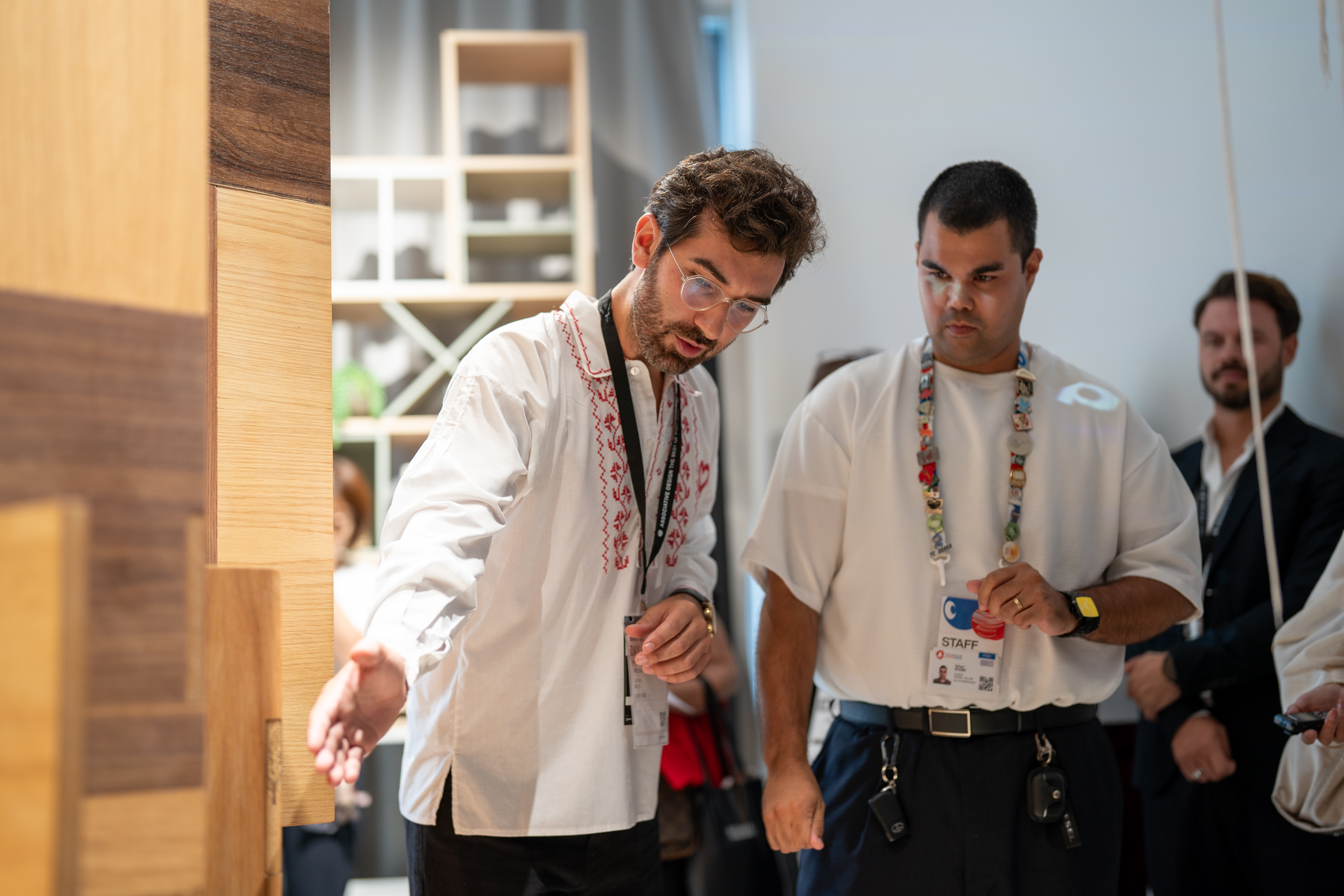 「SECOND LIFE」展初日の9月26日には、ポルトガルパビリオンにてプレスプレビューとレセプションが開催され、約20名の報道関係者やインテリア業界関係者が出席しました。冒頭では、ポルトガル貿易投資庁(AICEP)理事 パウロ・リオス・デ・オリヴェイラ氏が登壇し、ポルトガルのデザイン外交とサステナブル産業に対する戦略的なビジョンを紹介しました。その後、ポルトガル木材・家具産業協会(AIMMP)の「アソシアティブ・デザイン」プロジェクト シニア・プロジェクトマネージャーであり、キュレーターのサレテ・ペイシーニョ氏の案内で展示を鑑賞。展示コンセプトやキュレーションの背景についての説明が行われました。