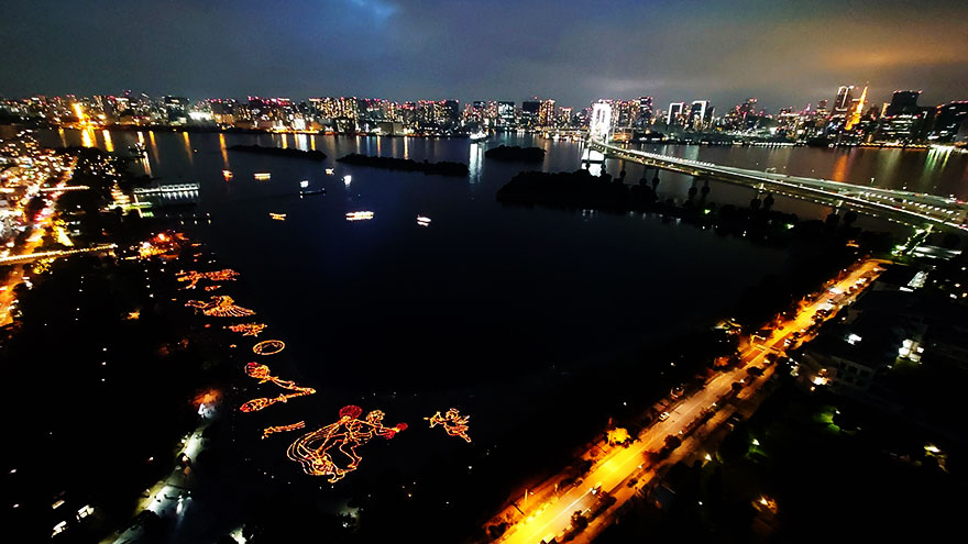 日没後、全てのペーパーランプに明かりが灯され、幻想的な雰囲気とともに、おだいばビーチに地上絵が浮かび上がります。
