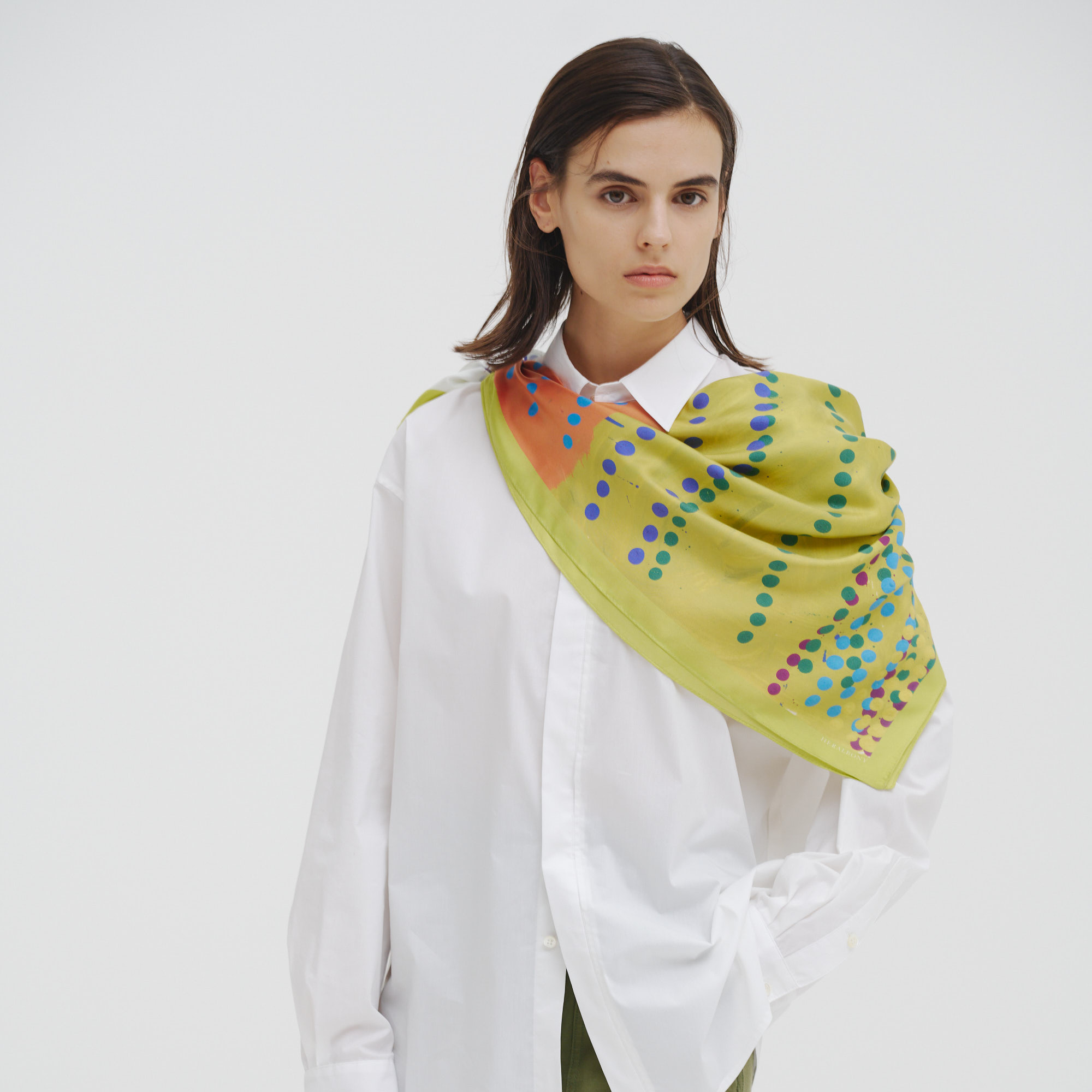 気軽に、自由に、スカーフをまとうためのシャツ。袖や前立てについたループにスカーフを通すだけで、あなただけのスタイリングが完成します。ロング丈のシャツワンピースは、背中にも3箇所のループがついており、プレーンなシルエットで性別問わず着られるベーシックシャツは、袖の肘部分にもループがついており、腕を動かすたびにスカーフが揺れる着こなしができます。