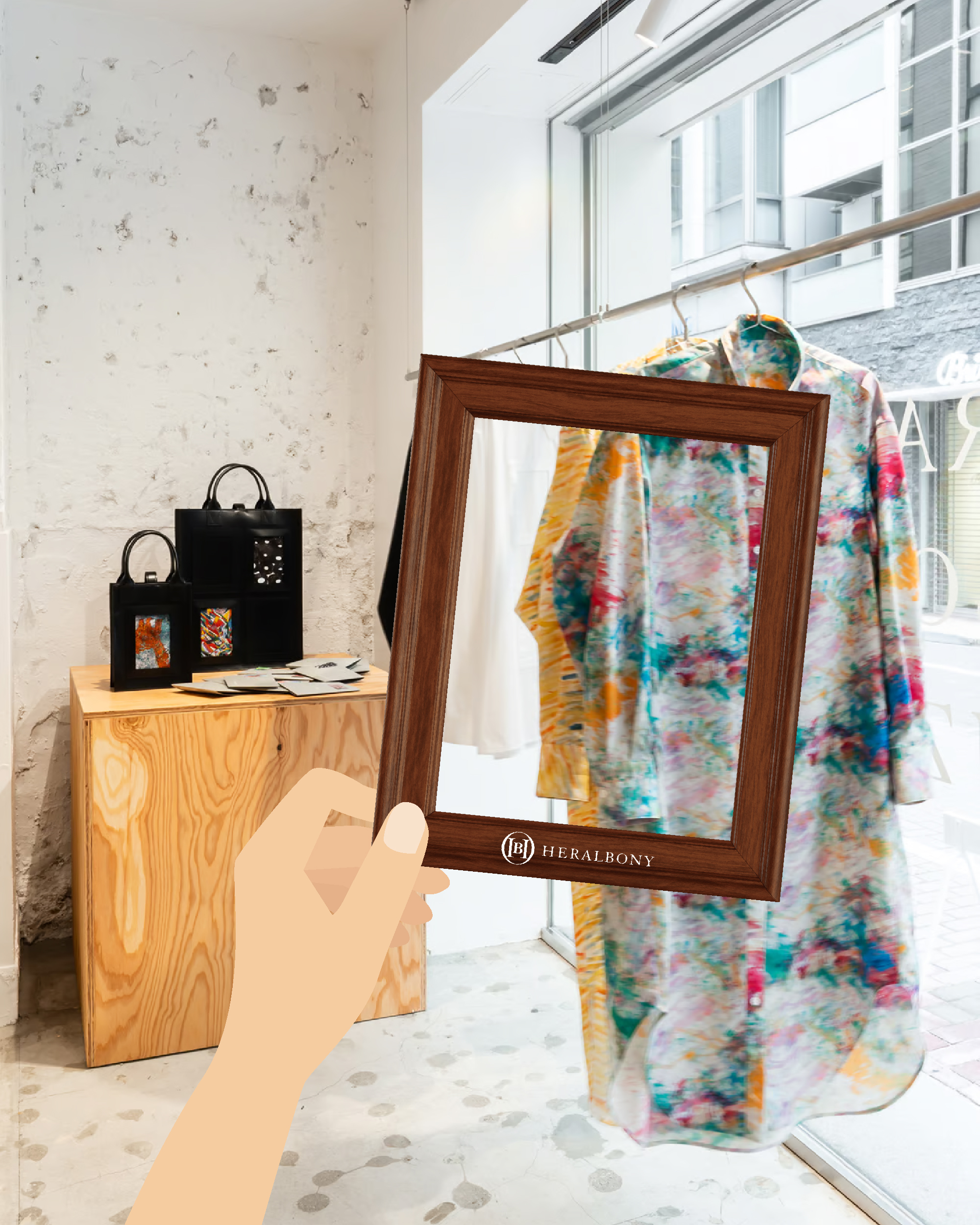 ポップアップストアでは、特別な「額装フレーム」を購入に限らず、ご来場の方に配布します。商品を含む店内を自由に撮影いただけ、お気に入りのアイテムにフレームをかざして撮影すれば、世界にひとつだけの“自分だけのアート体験”の完成です。