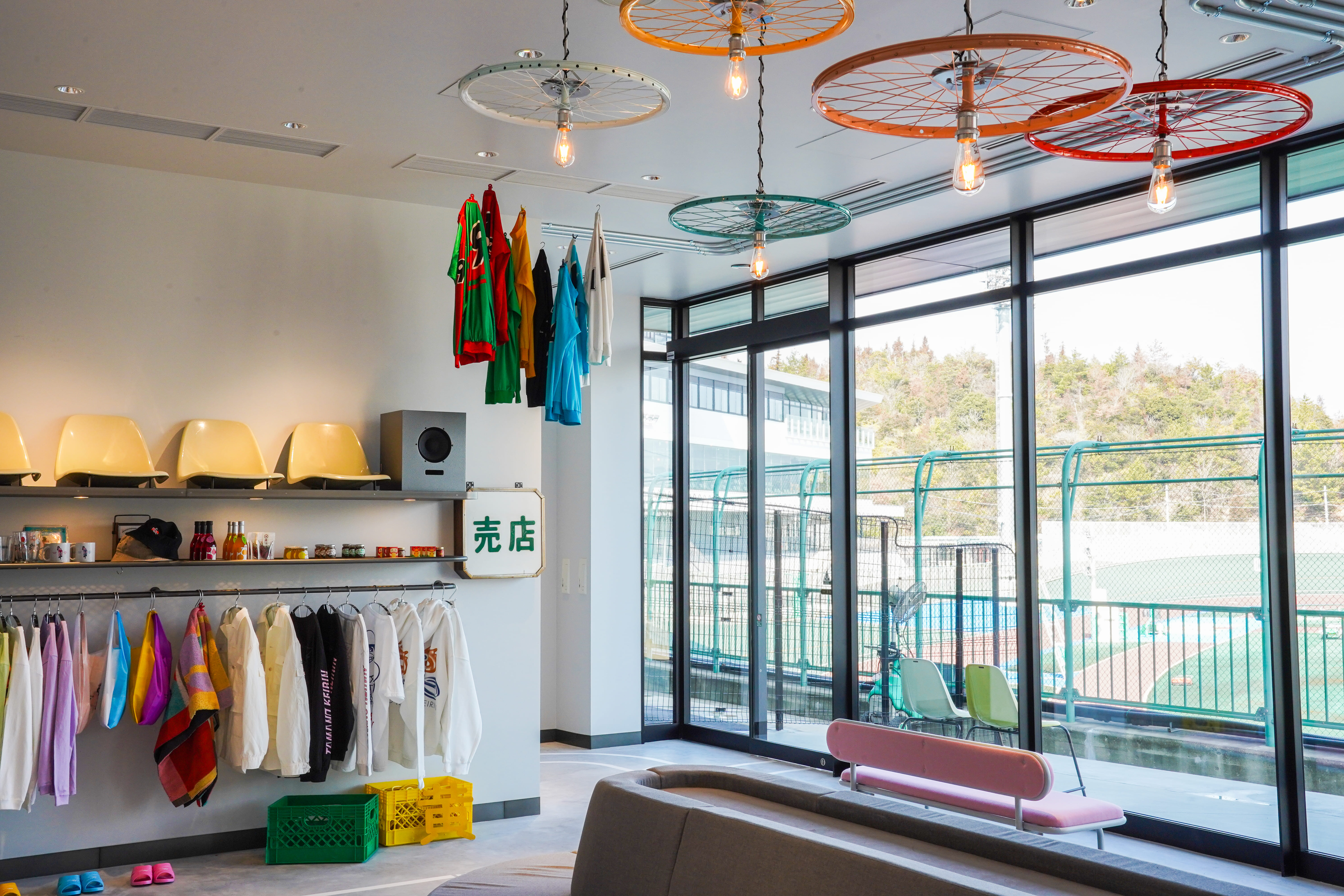 カラフルで独創的な自転車部品や競輪場の廃材を再生し、館内の装飾や客室インテリアとして展開しています。廊下を歩くだけで作品を鑑賞しながら競輪文化や歴史を知ることができる、他にない空間が館内に広がります。