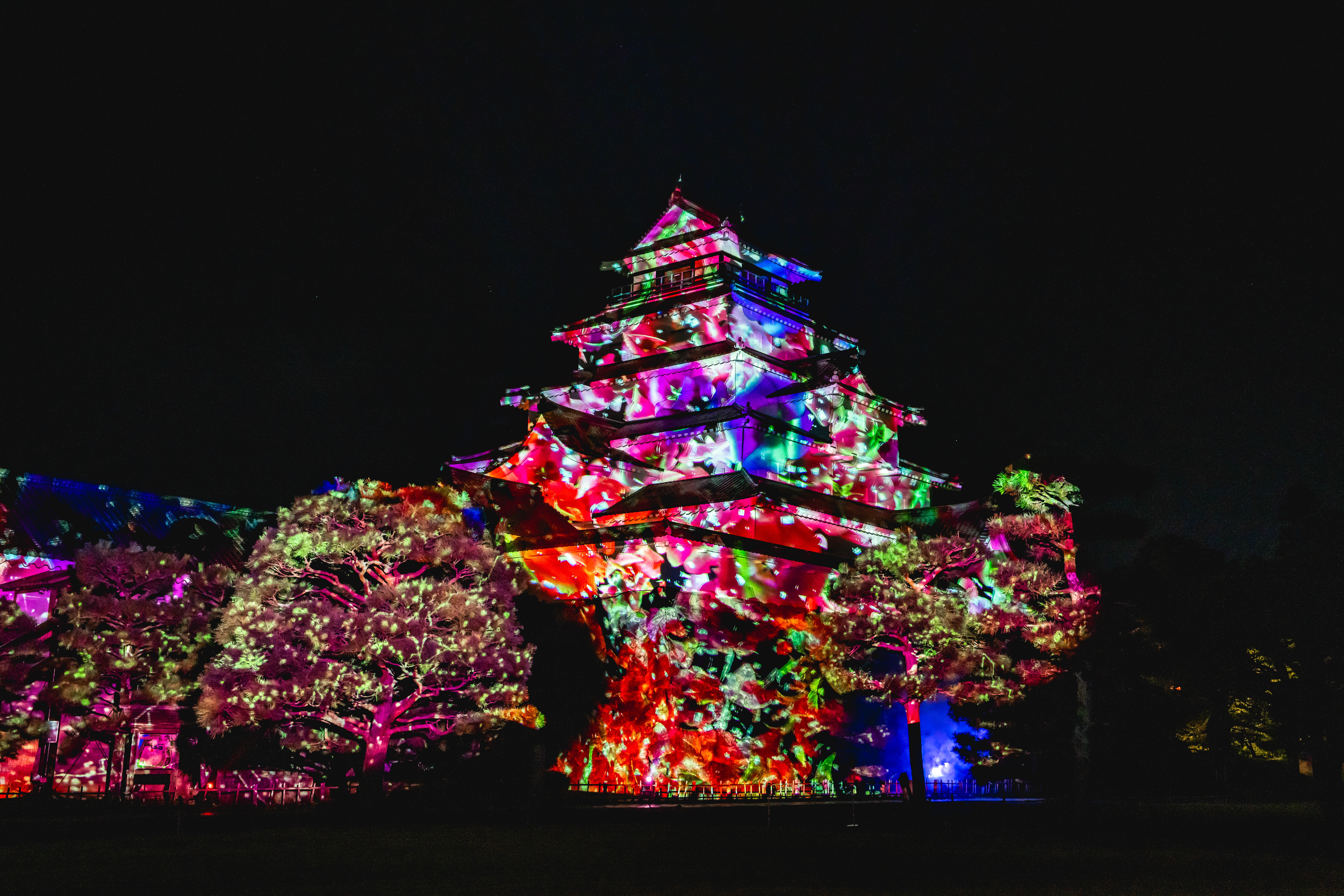全国の城の中でも屈指の美しさを誇る名城・鶴ヶ城の天守や石垣などに、会津塗や会津絵ろうそく、福島の花といった伝統文化をモチーフとしたデジタルアニメーションや、会津で活躍した絵師・雪村周継の絵画、桜の名所を象徴する美しく咲き誇る百花繚乱の花々のデジタルアートなどのプロジェクションマッピング映像を投影します。