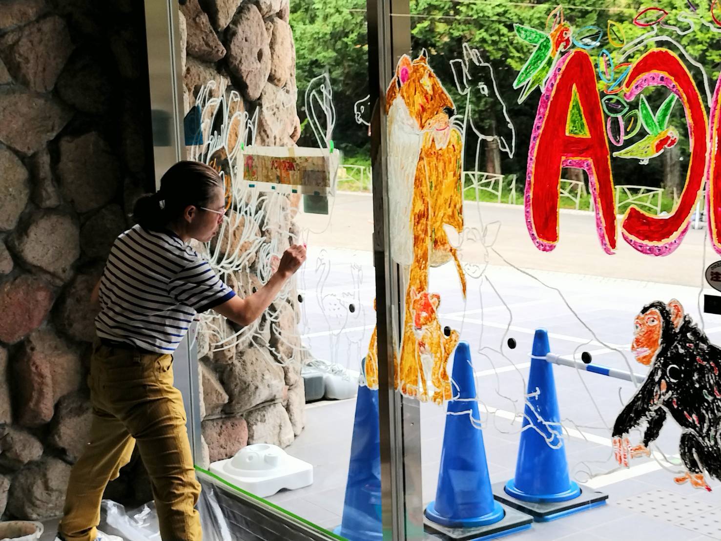 〇内容:キットパスを用いた窓ガラスへのウィンドウアート展示。アーティストによるライブペインティング。
