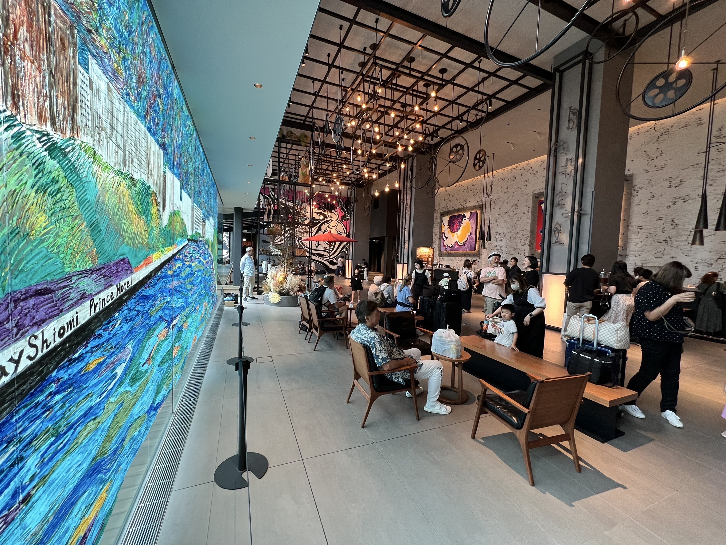 東京ベイ潮見プリンスホテルのメインロビーにダイナミックに描かれたキットパスウィンドウアート。