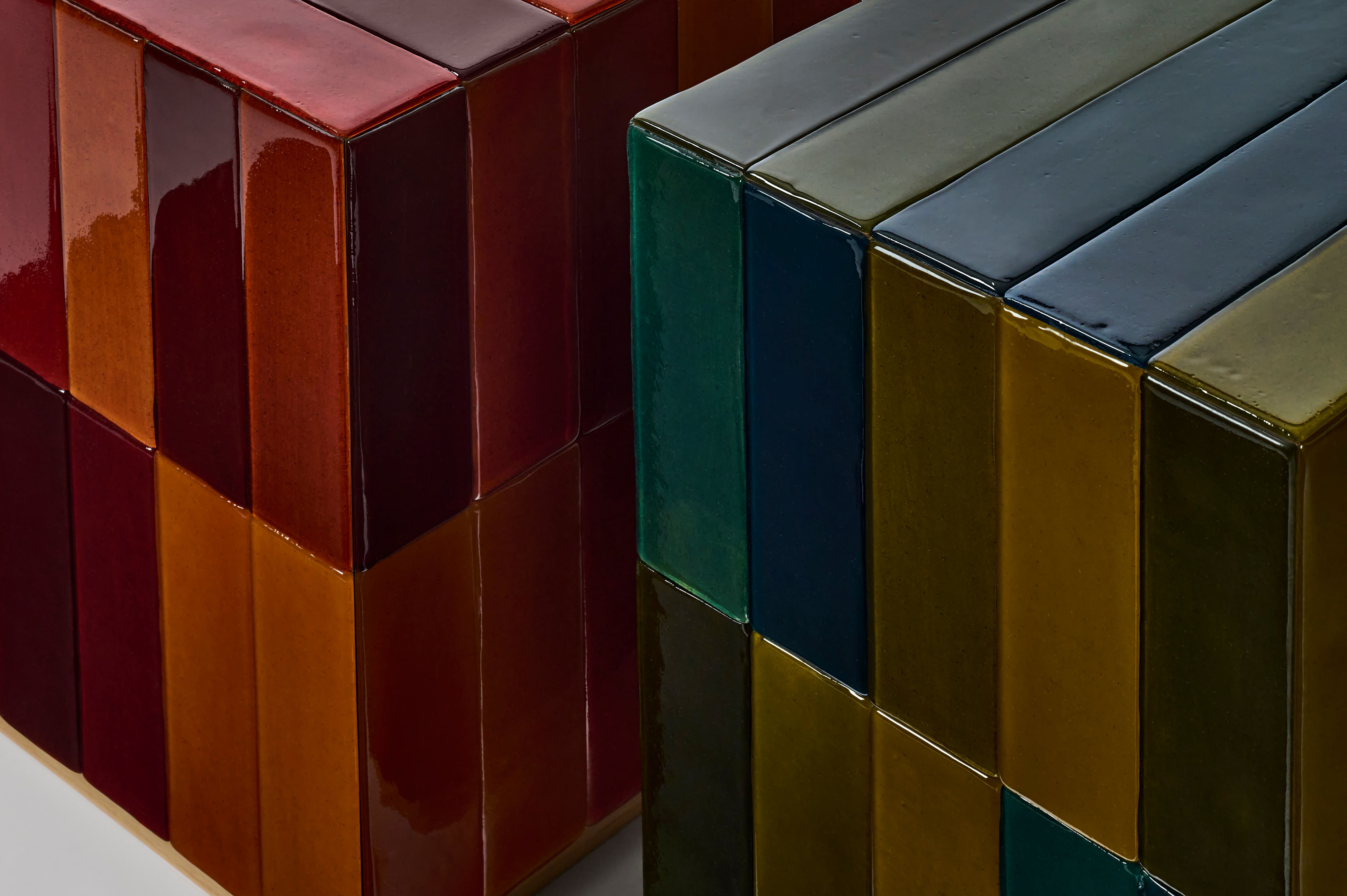 一般的に緑の印象が強い藻類ですが、さまざまな緑が存在する他、種類や生育環境によって赤や黄、青など多彩に色素が変化し、鮮やかで深みのある藻類にしか出せない自然の色が生まれます。そこで、当社が開発した彩り豊かな微細藻類の粉末を自然由来の樹脂と混合することでオリジナル素材を開発し、家具を制作。人工の色素の均一性とは対極に位置する藻類の色味や粒子の不安定さを生かしながら、自然由来の「色」の新たな可能性を探ります。