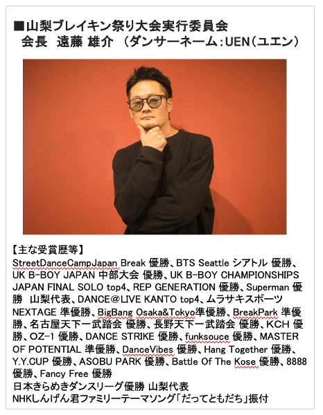 本大会実行委員会会長には、ブレイキンソロバトルをメインに国内外の数々の大会で優勝経験があり、公益社団法人日本ダンススポーツ連盟 (Japan DanceSport Federation :略称 JDSF) のブレイクダンス山梨県部部長及び「やまなし大使」を務めているUEN(ユエン)が就任し、イベントオーガナイザーとしてイベント開催します。