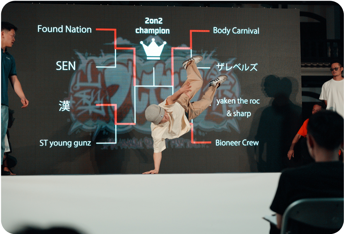 15歳以下を対象としたブレイキンソロバトルと年齢制限なしのオープンブレイキン2on2バトルが繰り広げられます。そして、ゲストバトラー、ジャッジ、DJ、MC、VJとして豪華ゲストが集結します。