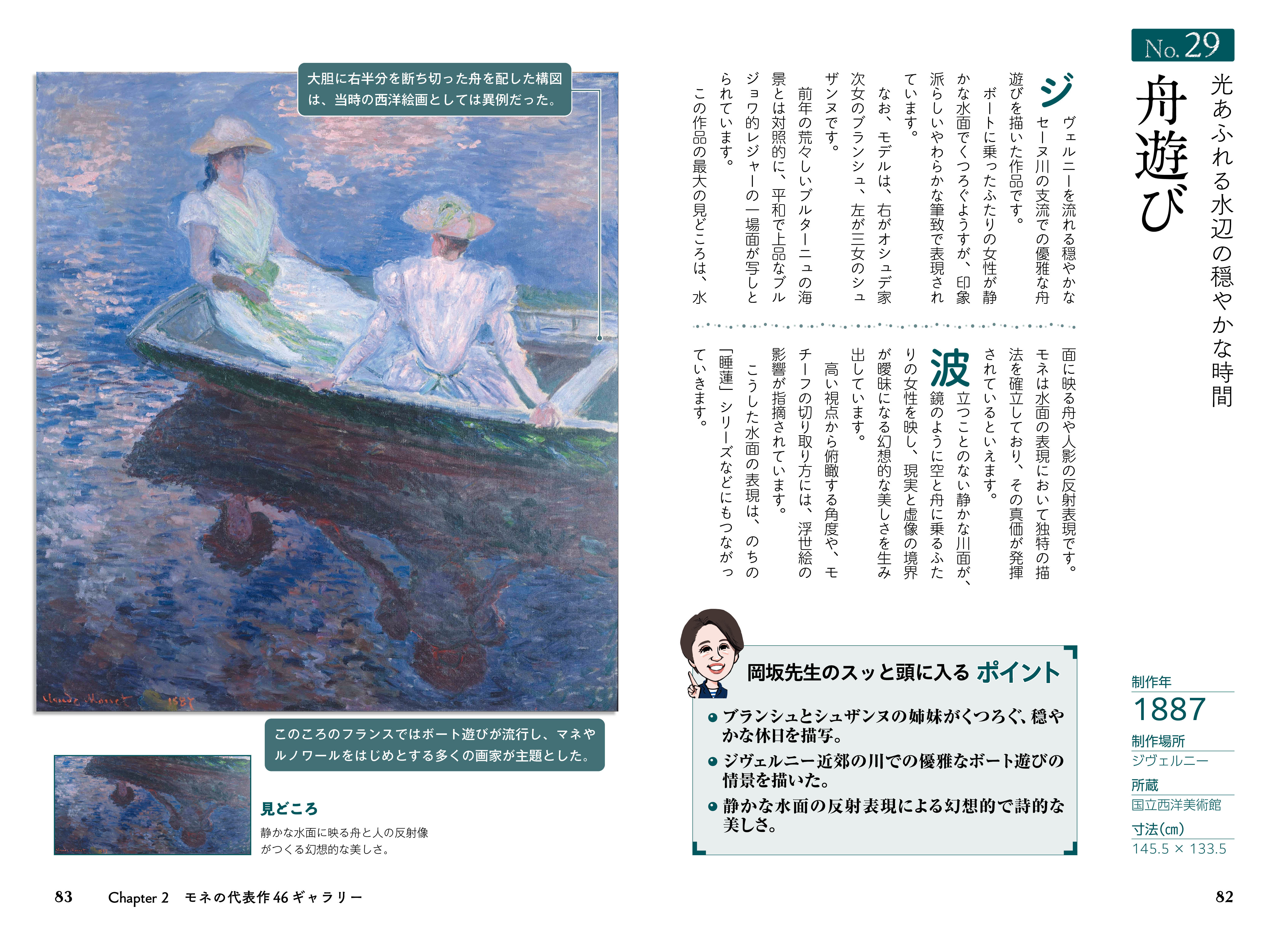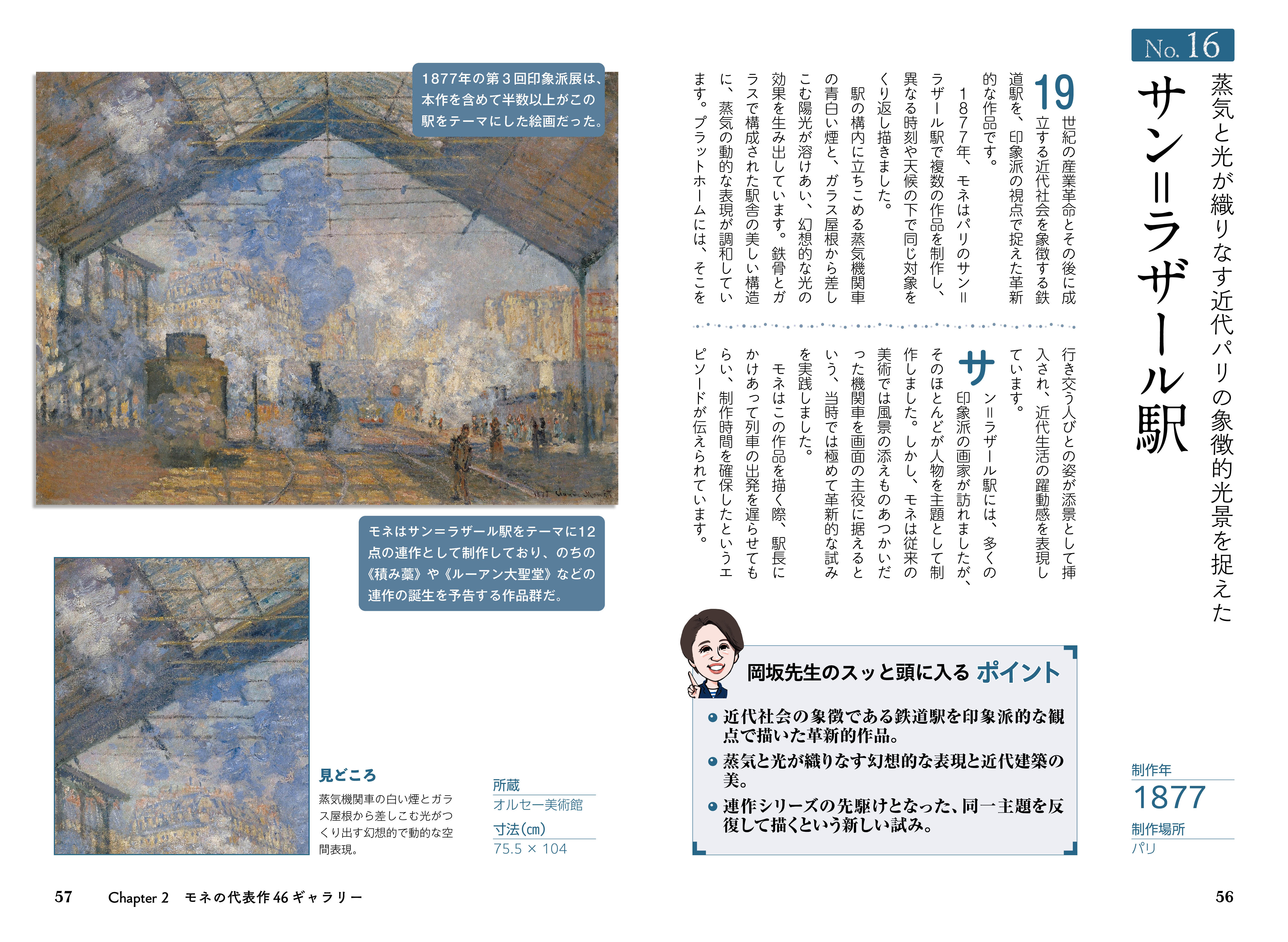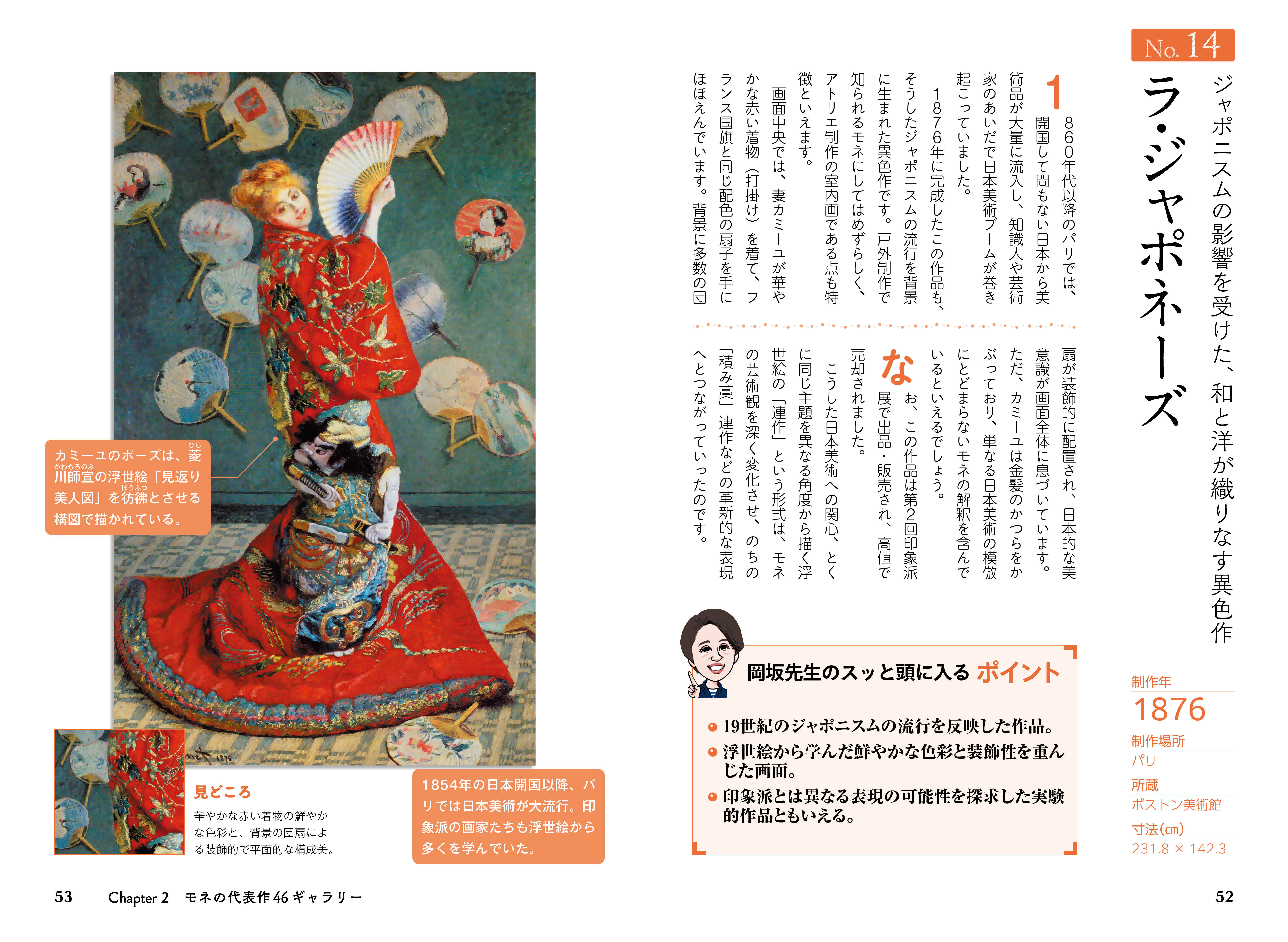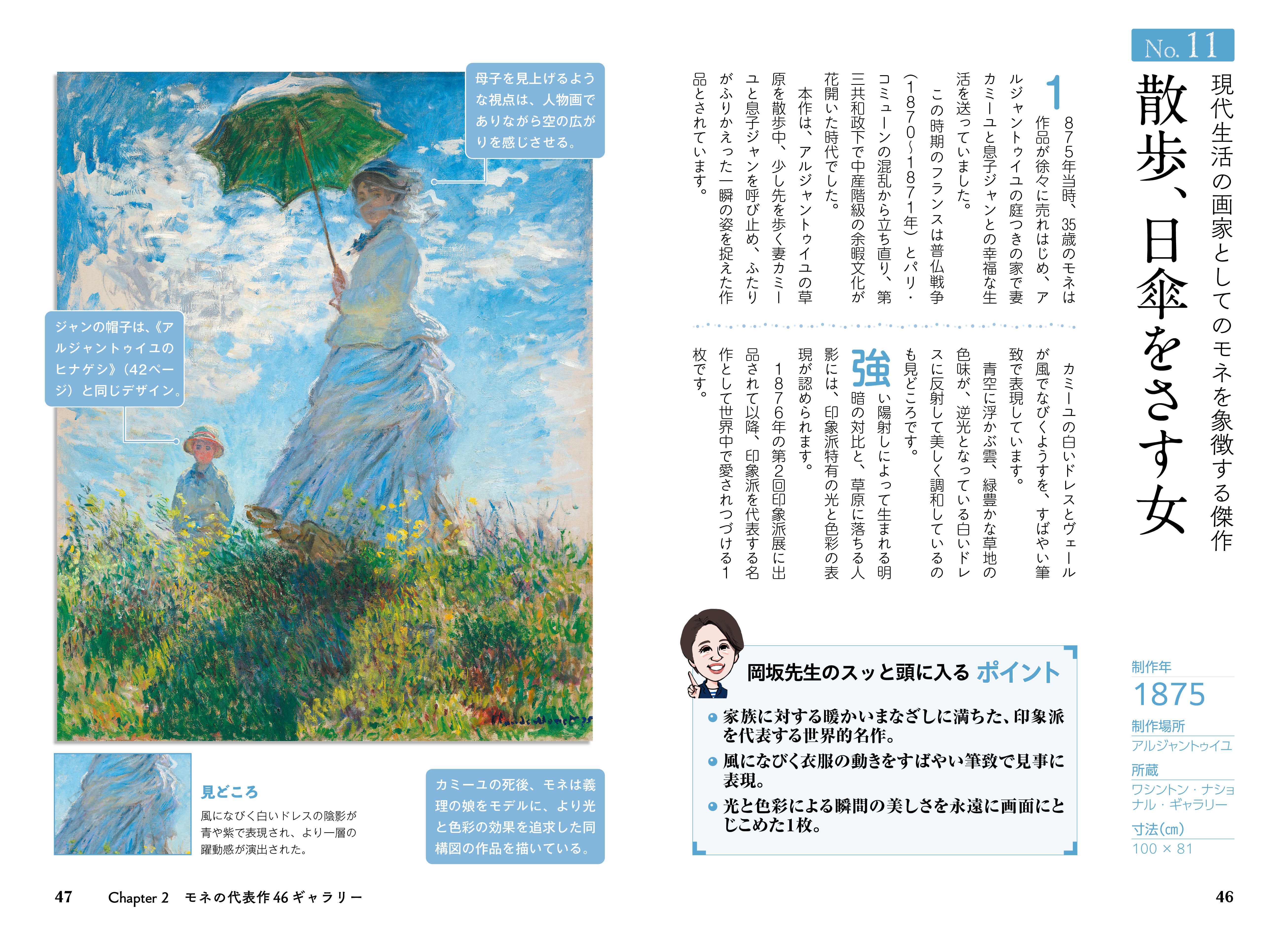 本書は、モネの波乱に満ちた生涯と人間的な魅力に迫りながら、代表作46点をわかりやすく解説。「印象派」という新たな絵画運動の中心人物として、従来の絵画の枠を超えたモネの芸術的な意図や表現の工夫に触れていきます。「印象、日の出」、「散歩、日傘をさす女」、「積み藁」、数々の「睡蓮」など、時代ごとに変化するモネの表現を、豊富な作品とともにじっくり味わえます。