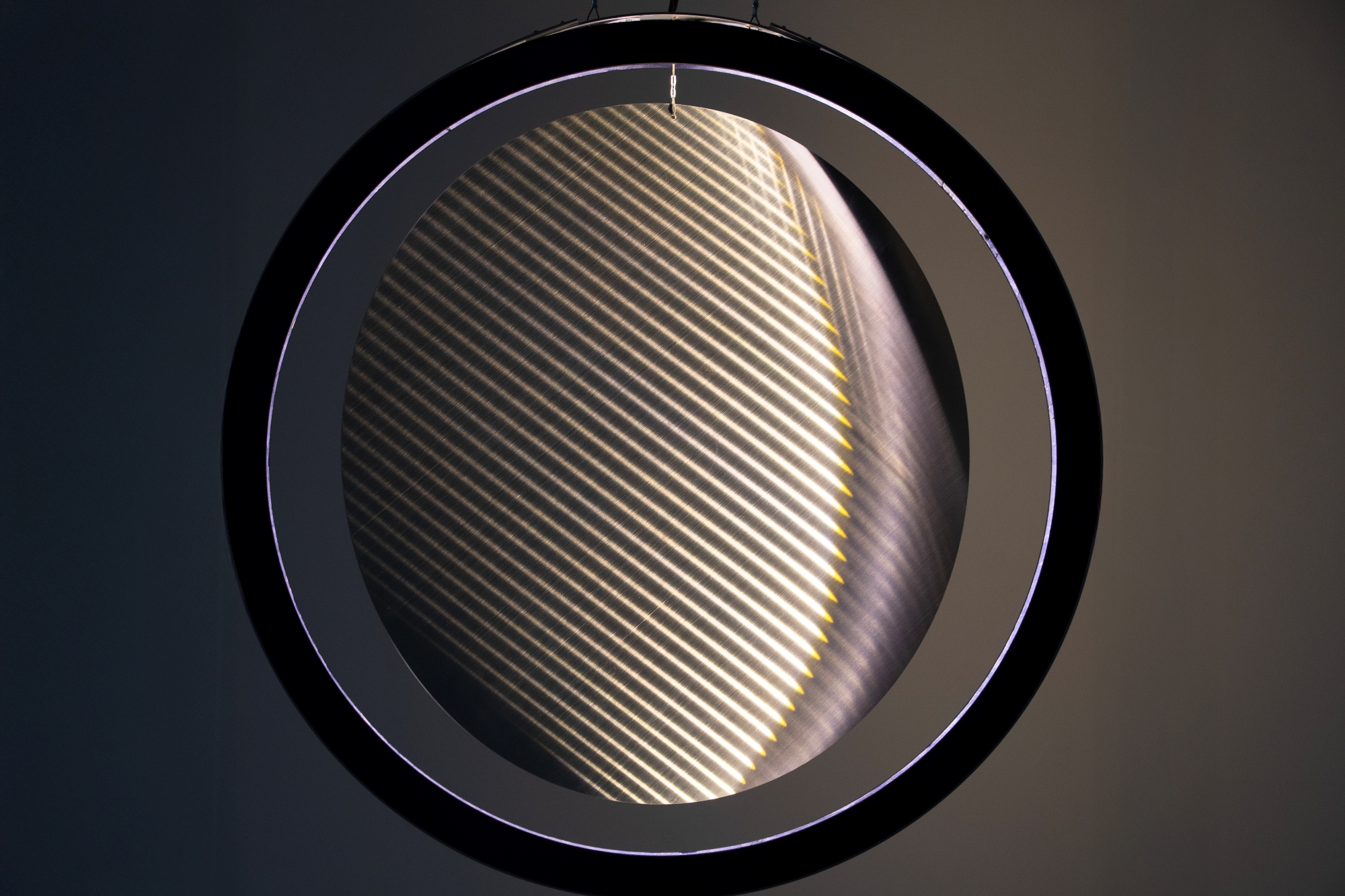 ゆっくりと回転する円盤に光が映り、月のように満ち欠けを繰り返す作品です。