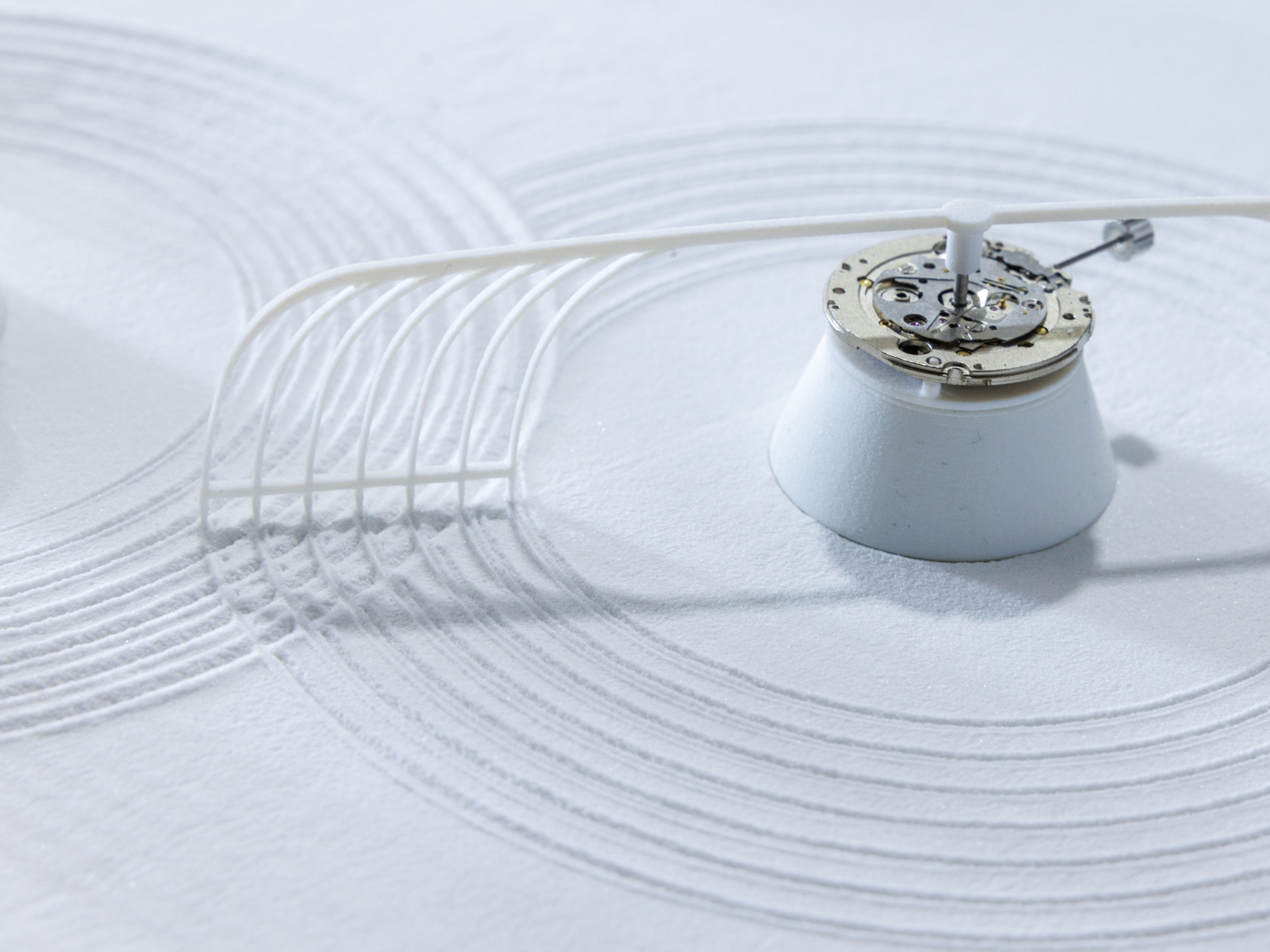 機械式時計は、人々の生活に規則正しい時の概念をもたらしました。本作では、その精緻な針の動きを拡張し、砂の上に紋様を描くことで、時間を可視化しています。描かれては消え、また刻まれる砂の模様は、常に姿を変えながらも絶えず続き、時の儚さと永続性を映し出します。日本的な静謐さを背景に、機械の律動と自然の循環を重ね合わせた作品です。