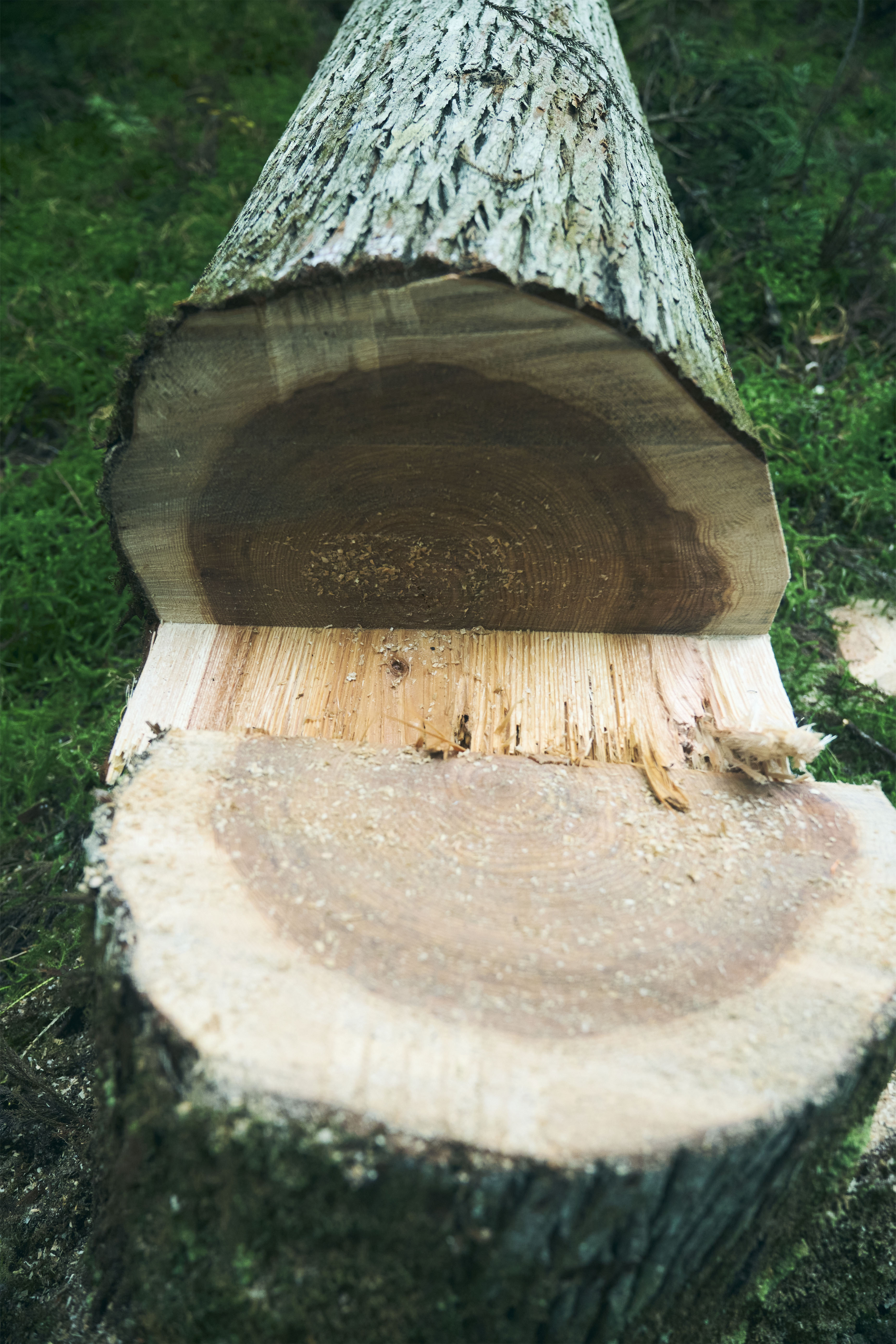 この作品は、明治期に植林されたと推定される吉野杉を用い、林業史や現場での観察を踏まえ制作しました。斧で割る「間割」の痕跡と重機部品をモチーフにしたステンレス製ジョイントを組み合わせ、素材と技法の対話を表現。偶然裂けた杉の魅力に着想を得て、歴史と人の営みへの敬意を込めています。