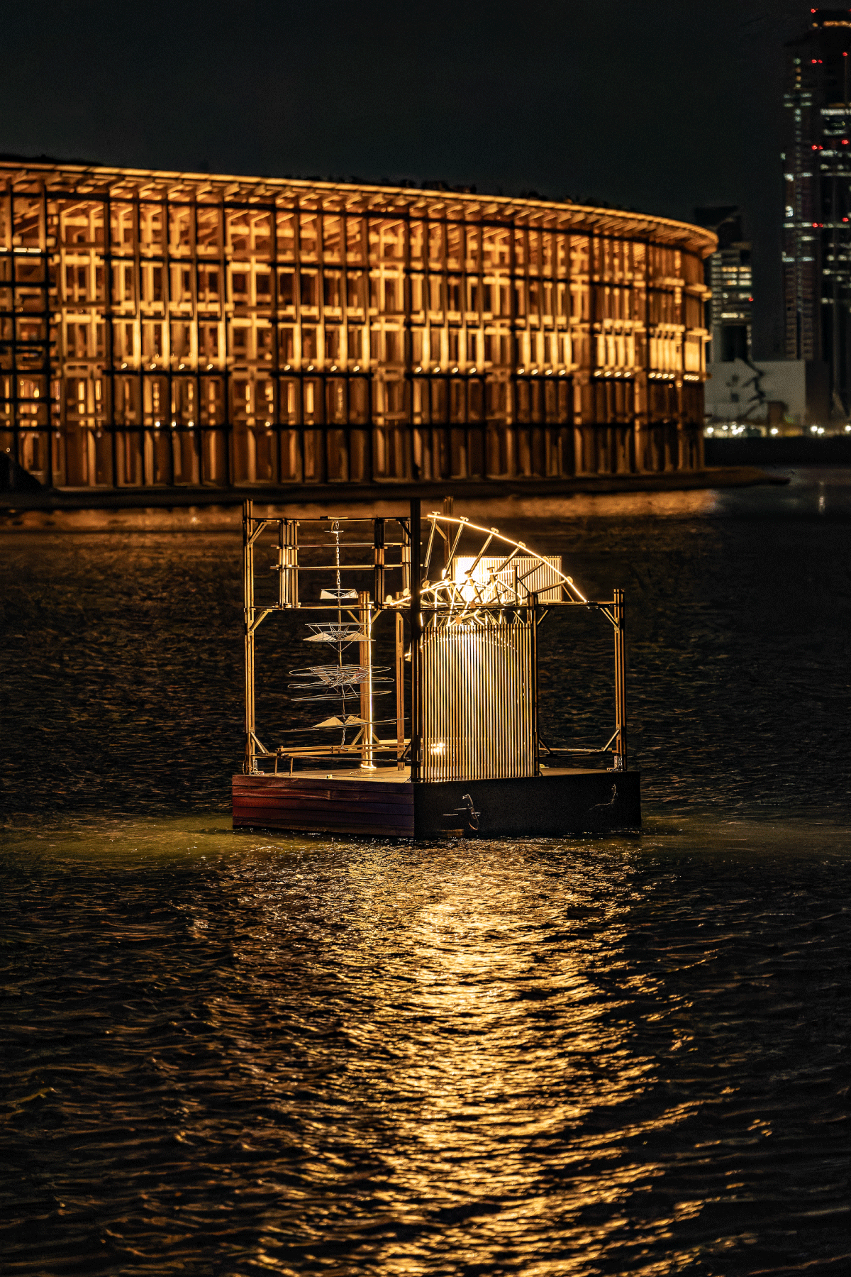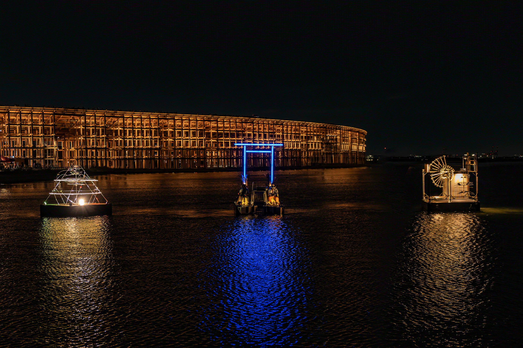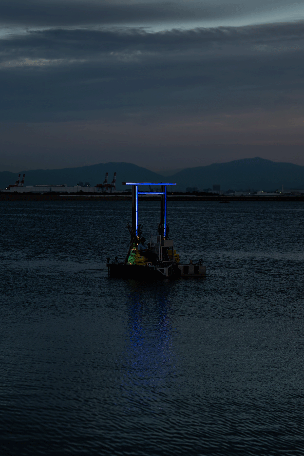 万博会場の水上に浮かぶこれらの作品は、海床(うみどこ)ロボットコンソーシアムによる環境配慮型の都市型自動運転船「海床ロボット」を活用して展示されています。