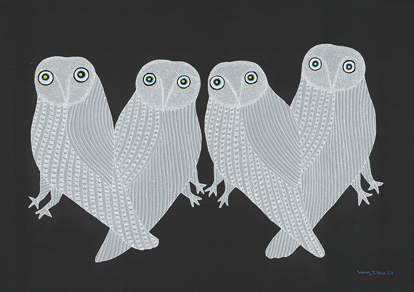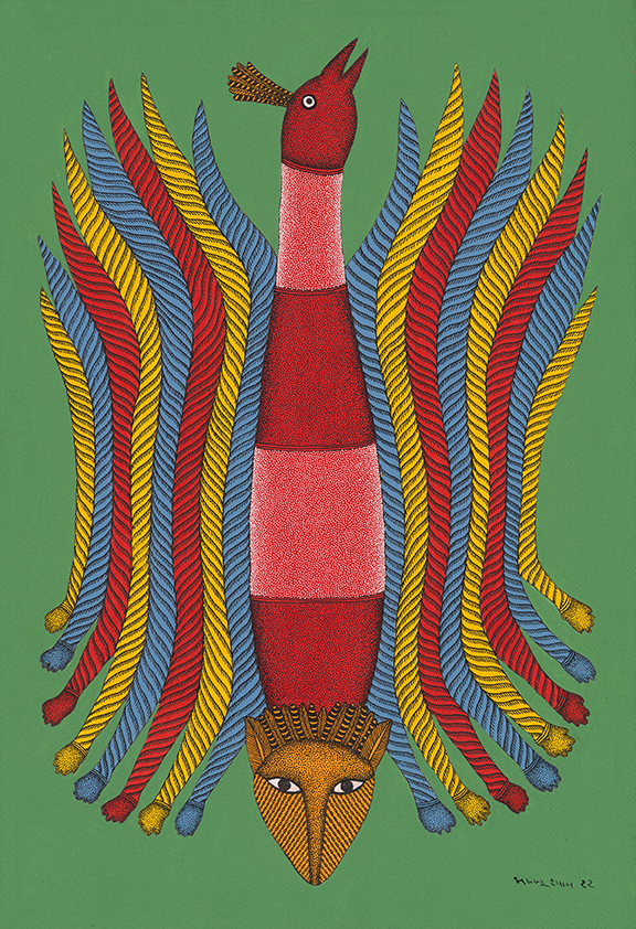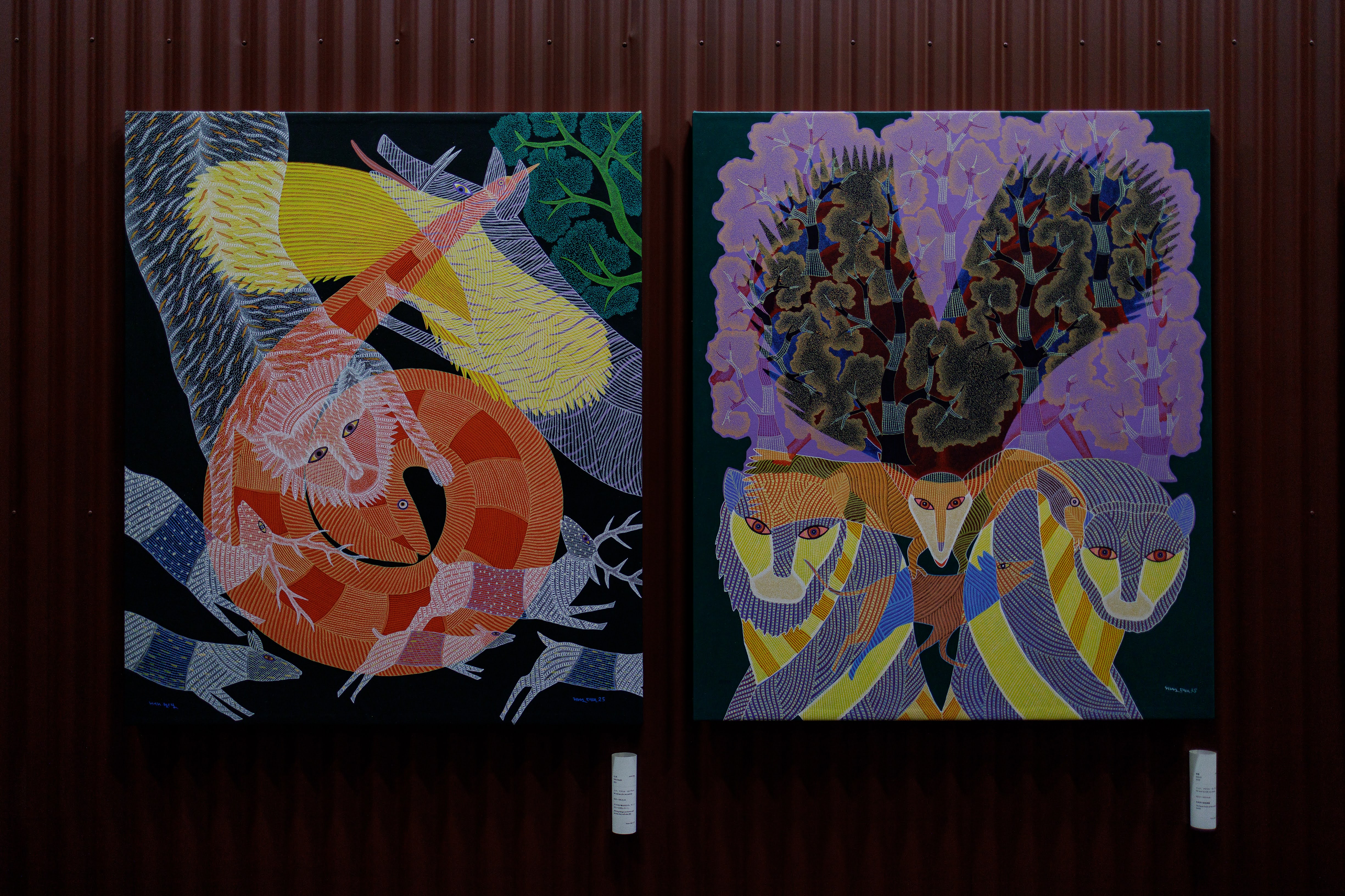 「自然への畏敬の念」「生命の循環」「ゴンド族の伝統」などをテーマに、Bhajju Shyamが描く独自の世界が広がります。