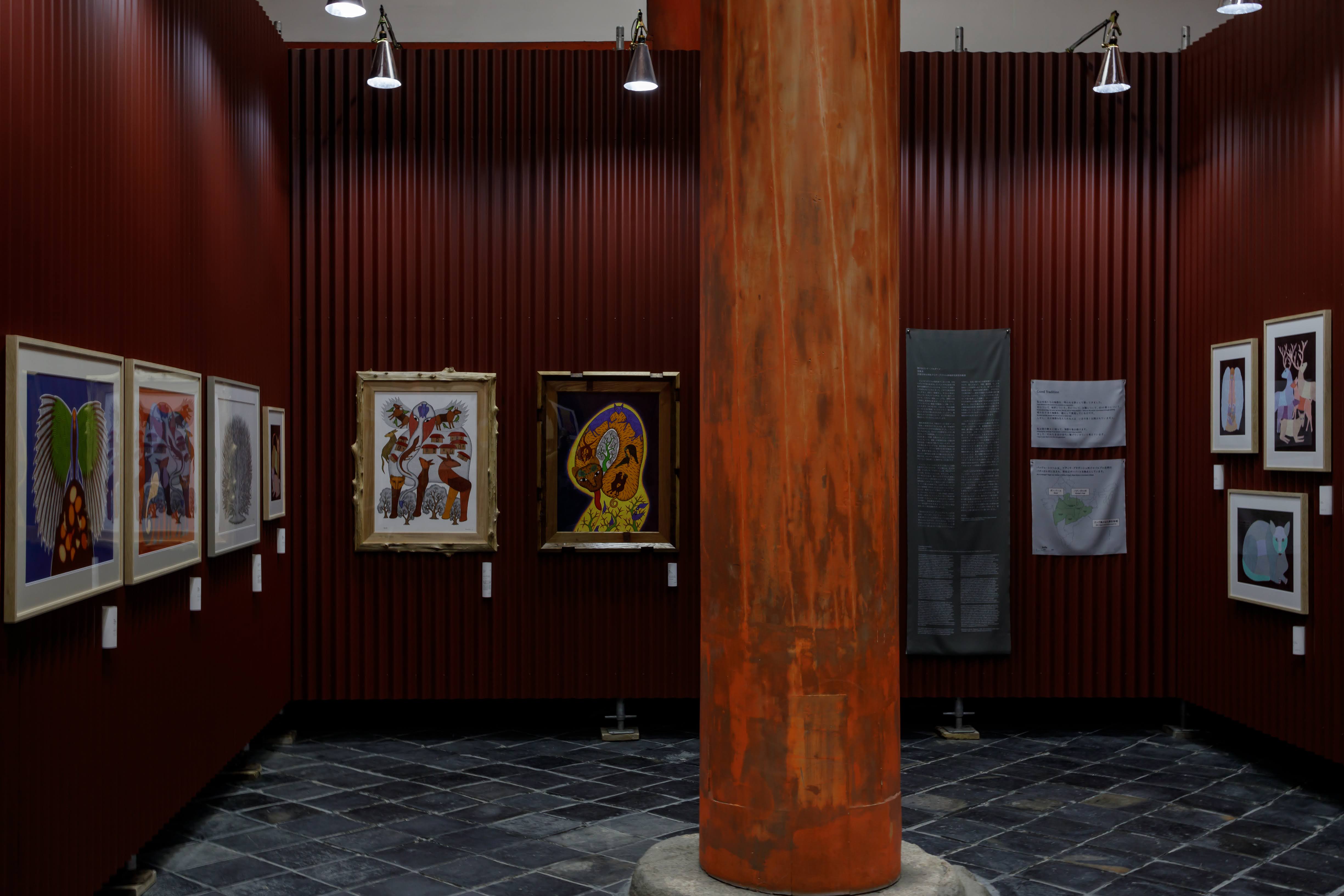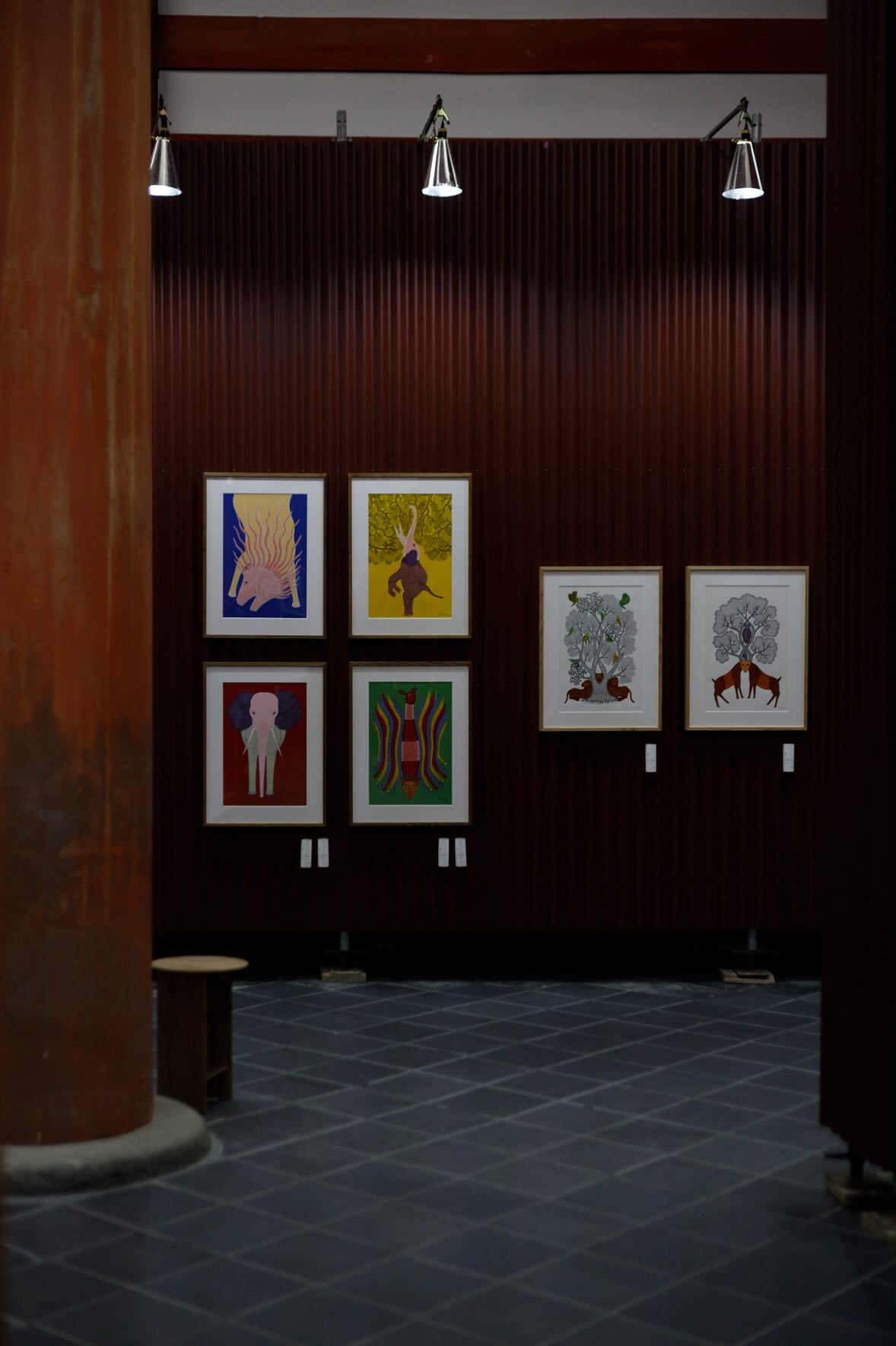 世界遺産・東寺 食堂(じきどう)の荘厳な空間を舞台に、Bhajju Shyamの静謐かつ鮮烈な作品が響き合う展示空間が広がります。空間デザインは、京都を拠点とするデザインファーム NEW DOMAINが担当。東寺の歴史的建築とインドのアートが融和する空間には、生命や自然への祈りが息づいています。