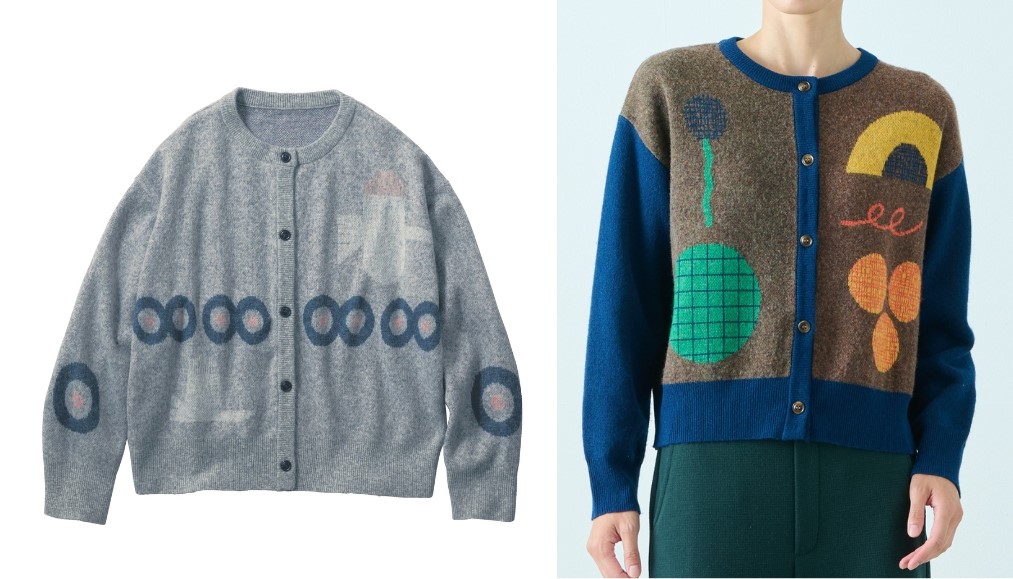 ▲しまむらひかりさん「とりとくだもの」(左) をニットカーディガン、ルームウェア(トップス)、ソックスのデザインに