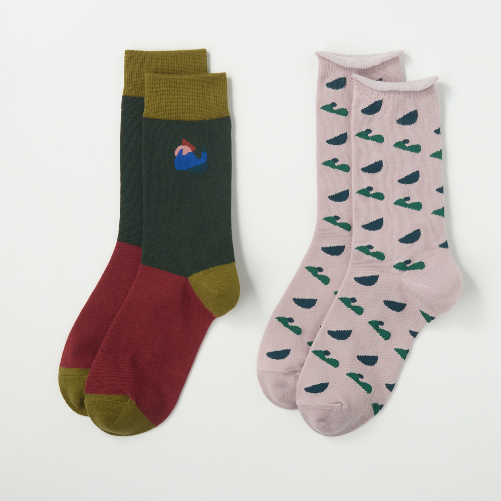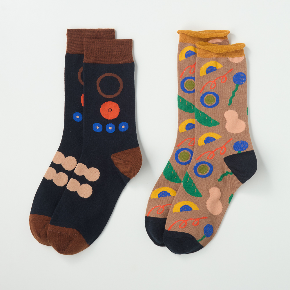 ▲ワタミユさんの作品「散策」(左) をソックスのデザインに