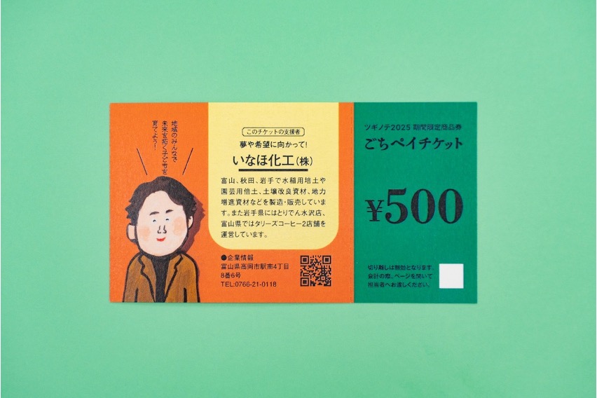 商品券は500円×6枚綴りの3,000円分で、今回400部を発行します。チケットは一枚ずつミシン目の入った作りになっており、ツギノテ出店の店舗で支払いの際にちぎって利用できます。