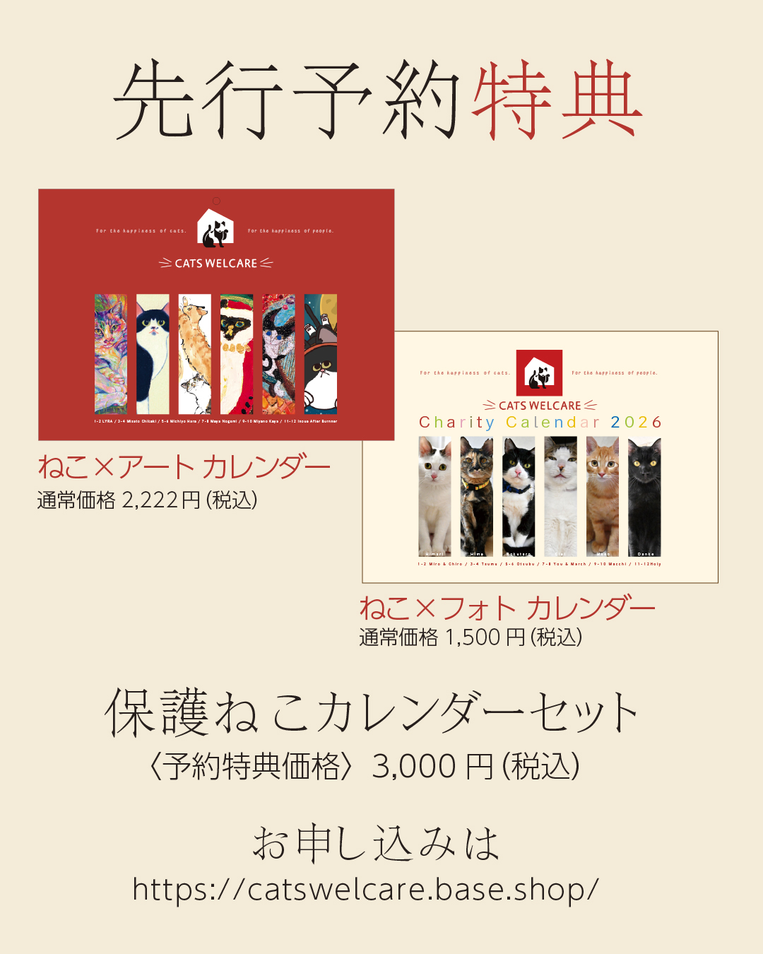 このカレンダーの売上はすべて、猫たちの医療費や保護活動費に充てられます。
