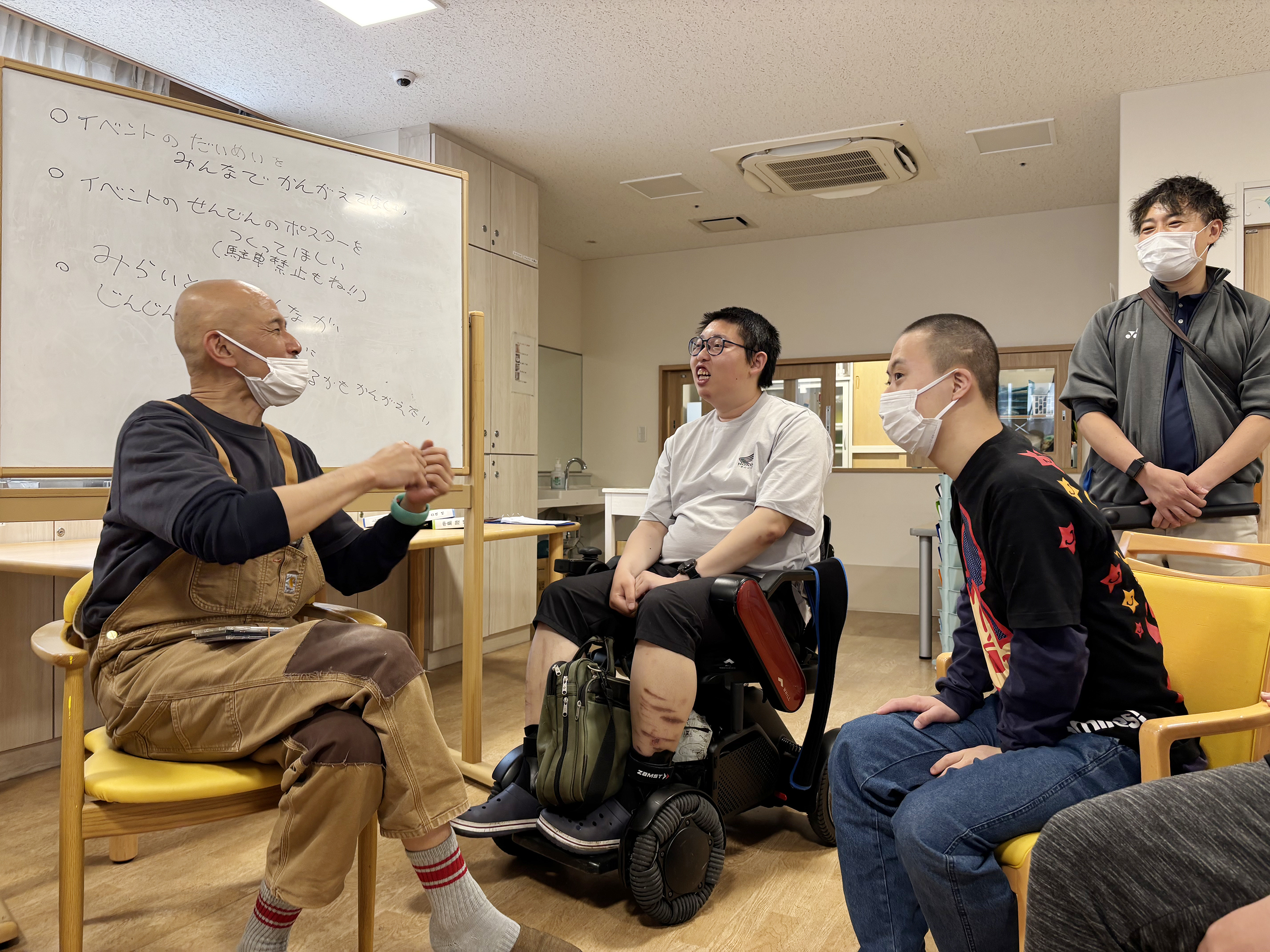 プロジェクト名について相談するきむらとしろうじんじんと浅草みらいどの利用者、その様子を見守る職員。
