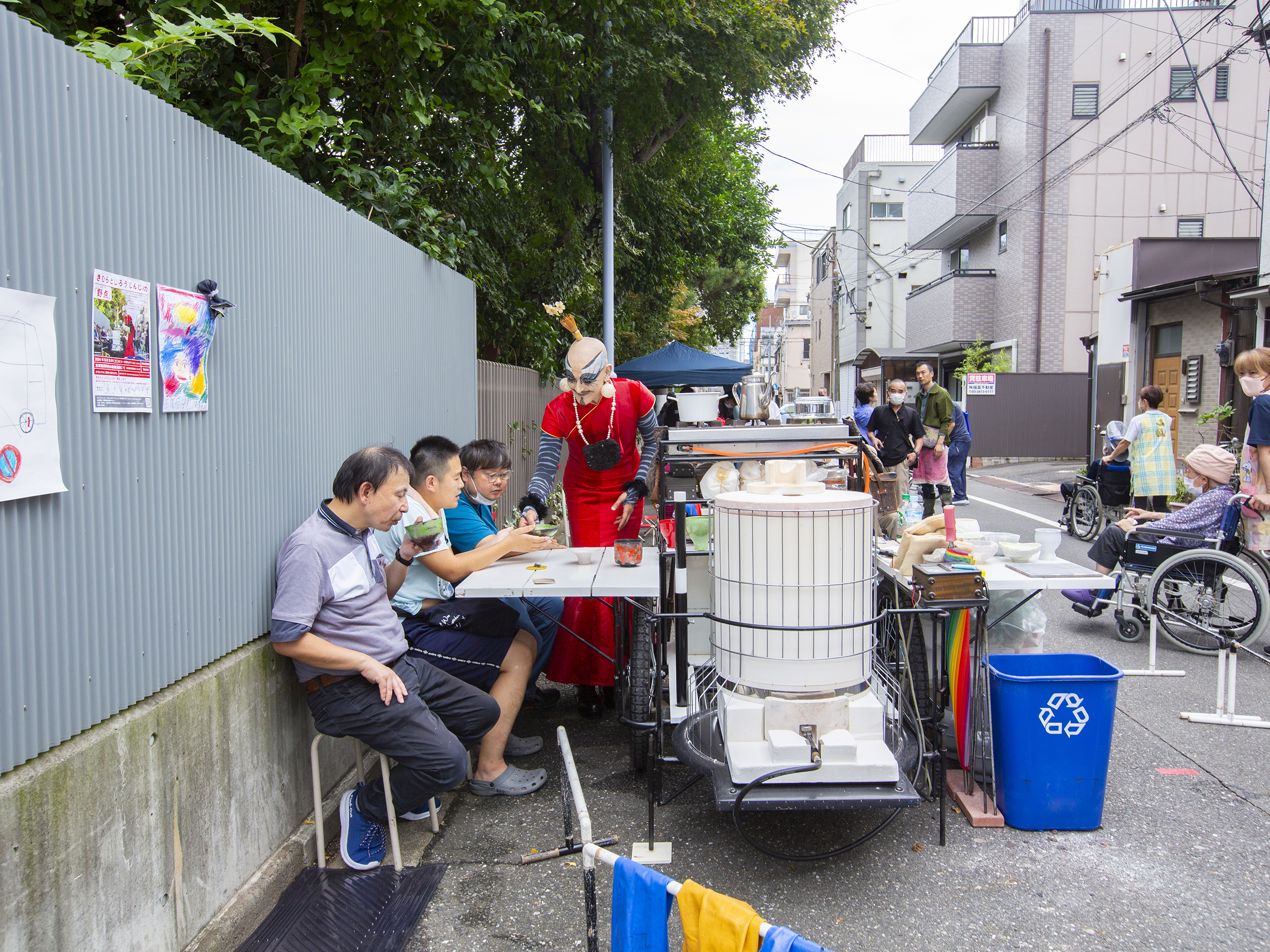 東京都と公益財団法人東京都歴史文化財団 アーツカウンシル東京、一般社団法人谷中のおかってが主催するTURN LANDプログラムは、障害福祉施設 浅草みらいどと協働プロジェクトを実施しています。アーティスト・きむらとしろうじんじん氏によるアートプロジェクト「野点(のだて)」*を軸に、約半年間かけて利用者施設と共につくりあげた一日限りの特別企画「山谷堀 大茶湯かぞく(さんやぼり おおちゃのゆかぞく) 」を開催します。