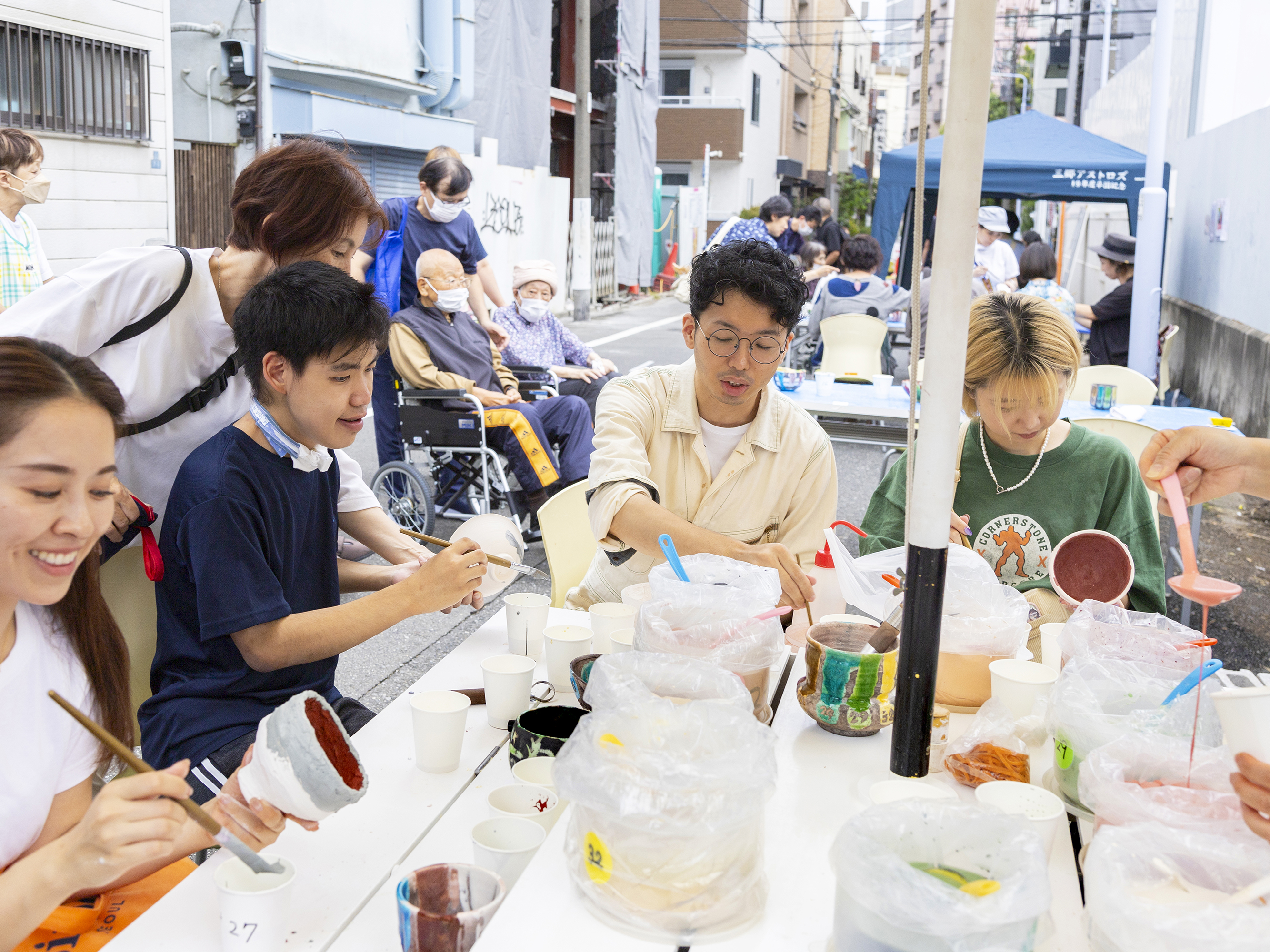 浅草みらいどの利用者や地域の人々が、自分で絵付けしたお茶碗で抹茶を飲む様子。