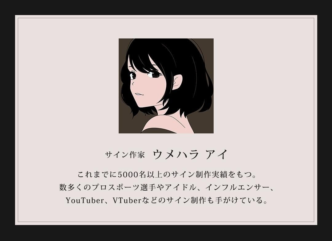 『Signature(シグネチャー)』は、プロスポーツ選手やアイドル、インフルエンサー、YouTuberやVTuberなど、これまでに5000名以上のサインを手掛けてきた人気サイン作家・ウメハラアイさんとのコラボレーションによって誕生。お客様の名前から世界に一つだけのオリジナルサインを作家がデザイン、そのまま印鑑に仕上げる画期的なサービスです。