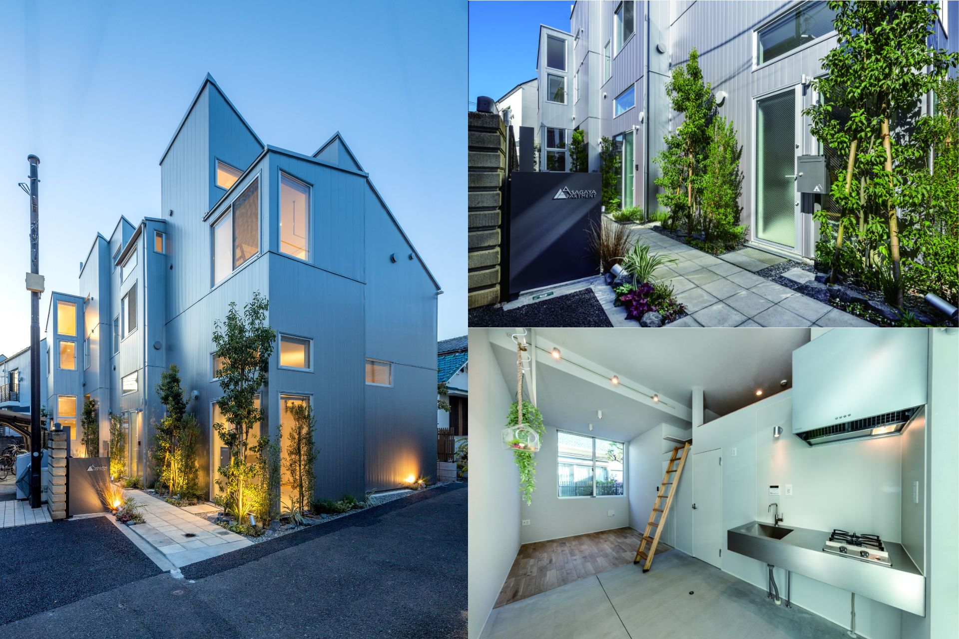 それぞれの住戸を整形に整えつつ、外形は敷地に合わせながら小さいボリュームが集まったような形とすることで、周辺の街並みとスケール的な連続性を生みだしている。1階、2階ともロフトスペースをつくることで、1階は暗くなりがちな住居に広がりが生まれ、2階では屋根の高さの操作と重ね合わされて、内観外観とも変化が生まれている。大きな構成を持ちながらも、各部位にそれぞれに個性ある住戸が集まる建物となった。