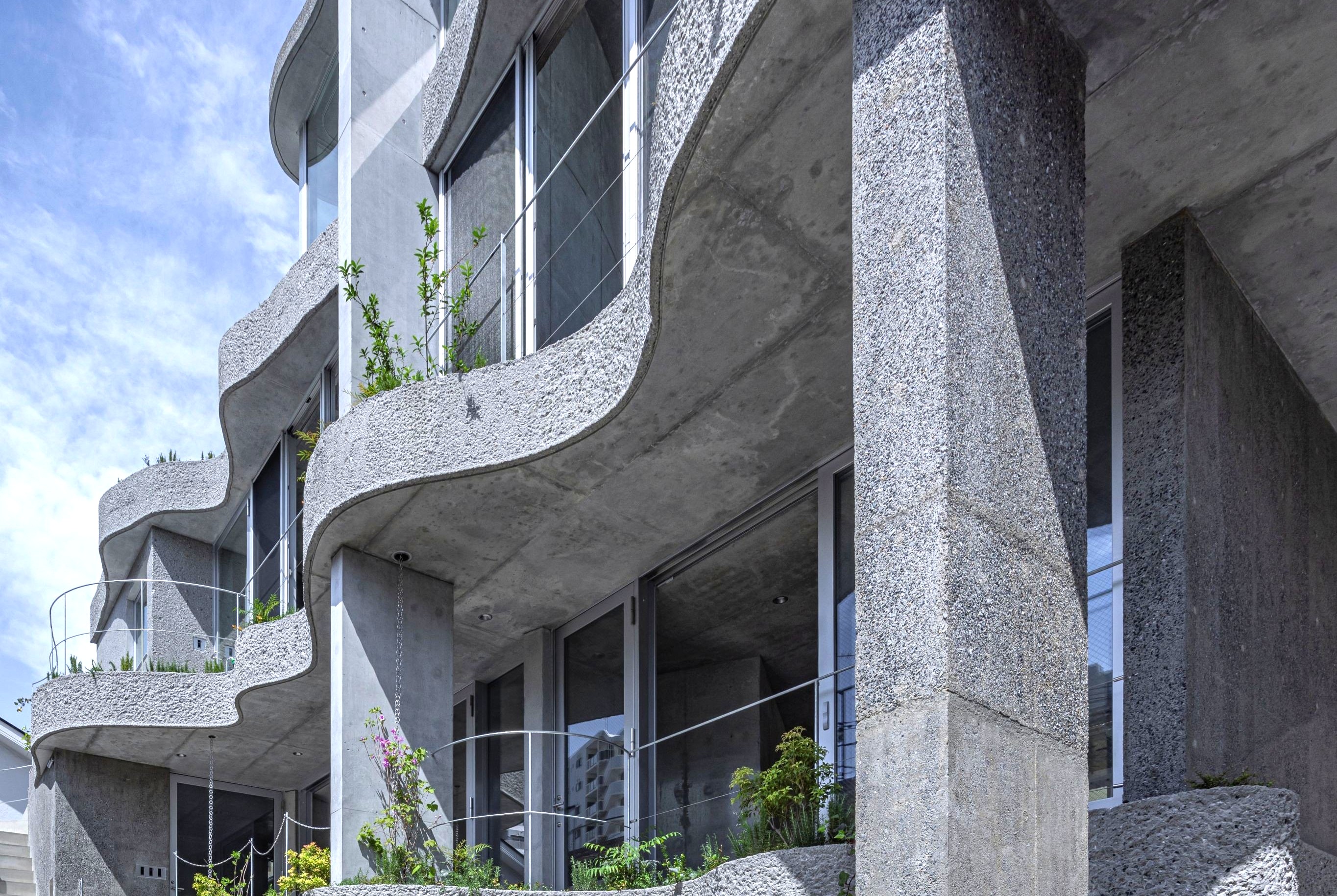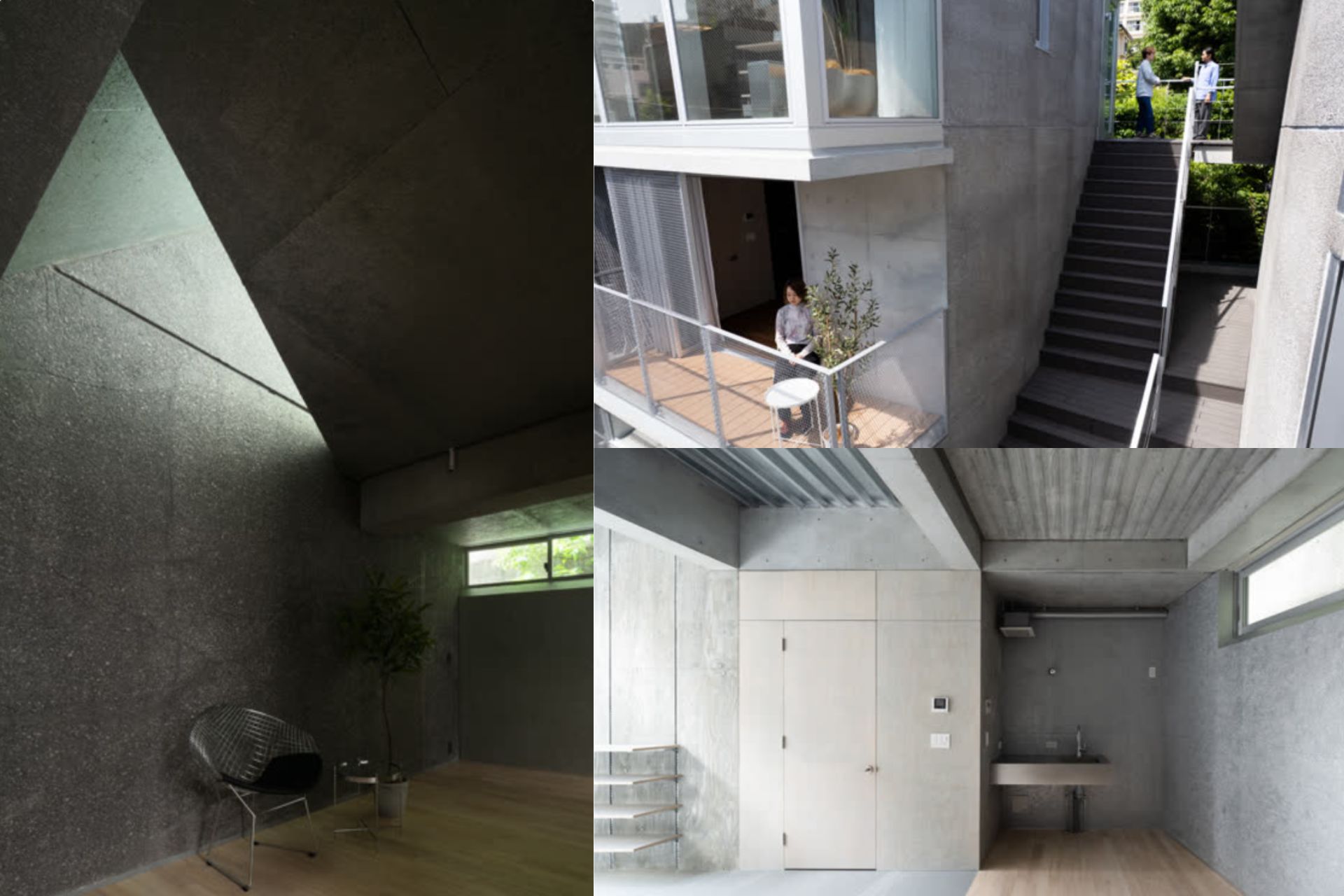 住宅が密集し、大きな高低差のある北側は擁壁で囲まれ、地中のようにも感じられる環境のなか、難しい工事条件と空間の最大化をクリアするため、コンクリートに打ち込まれたものや型枠で多様な表情をつくり、ささやかに差し込む光や影など季節のうつろいに応じて変化する明るく風通しの良いテナントオフィスと長屋住戸の計画。