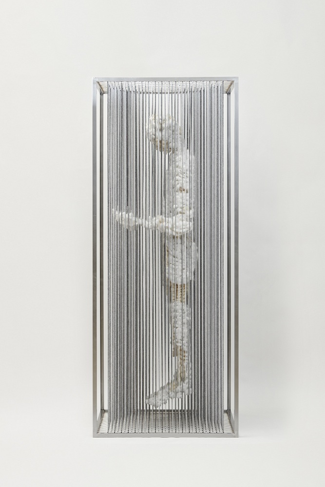 黒瀧は、繊維が交差することで立体的な構造が生まれる織物の造形に着眼を得て、手作業を 通じた経糸と緯糸の組み合わせを用いた、立体作品を制作しています。 彼の代表作である、「Human」シリーズでは、規則的な糸の配置で構成されるフレームの中に人間を閉じ込めることで、パターン化された現代社会や人間の思考を浮き彫りにさせます。彼は自身の作品を通じて、空虚な現代社会や彼が捉える人間の視点を浮かび上がらせ、人々をアルゴリズムからの解放へと導くことを試みます。