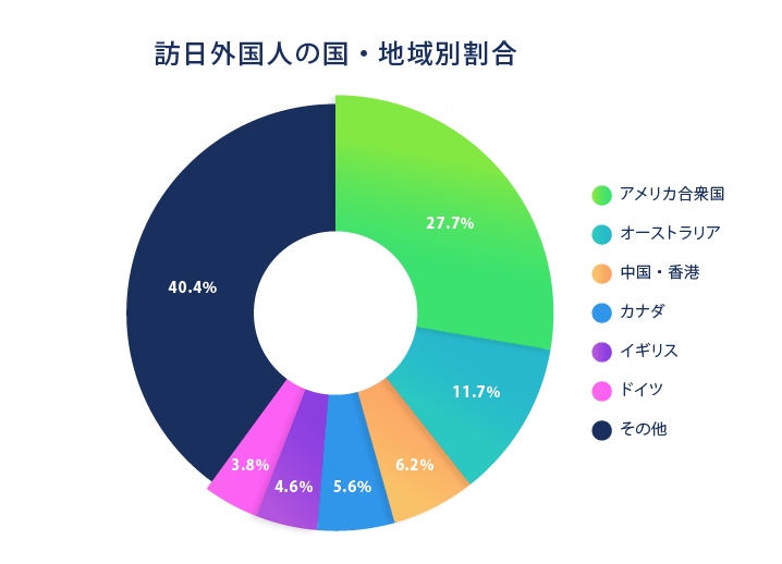 来館者のうち約500万人が訪日外国人です。アメリカ、オーストラリア、中国・香港、カナダ、イギリス、ドイツなど、遠方からの来館者も多く、来館者の約70%以上が来日前にチケットを購入しており、当館を訪問目的の一つとして東京を訪れる傾向がみられました(※2)。