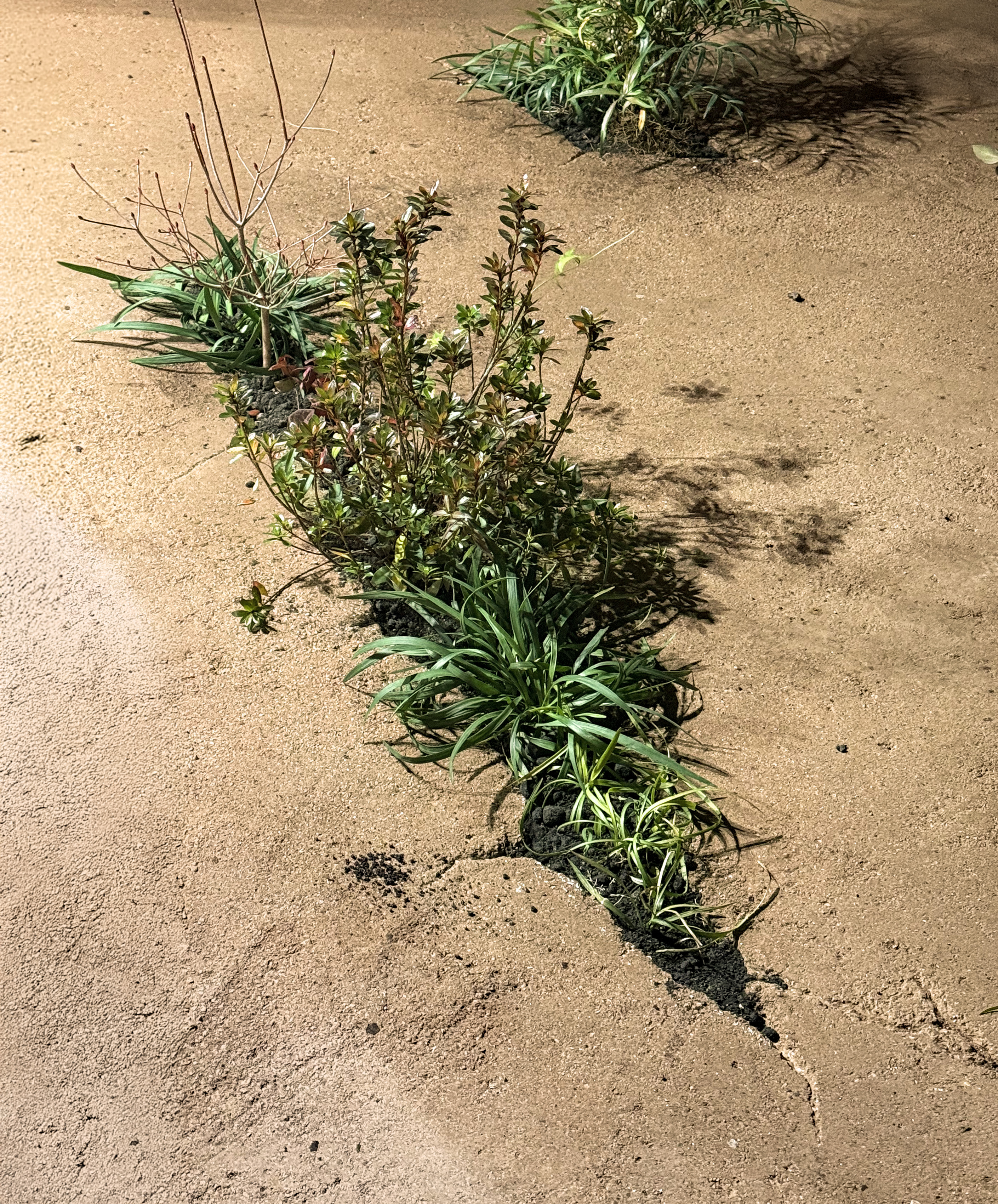 屋外スペースには植栽を施して緑を増やし、植物や土塊を活かした作品を公開中。日没後に現れる作品もあります。