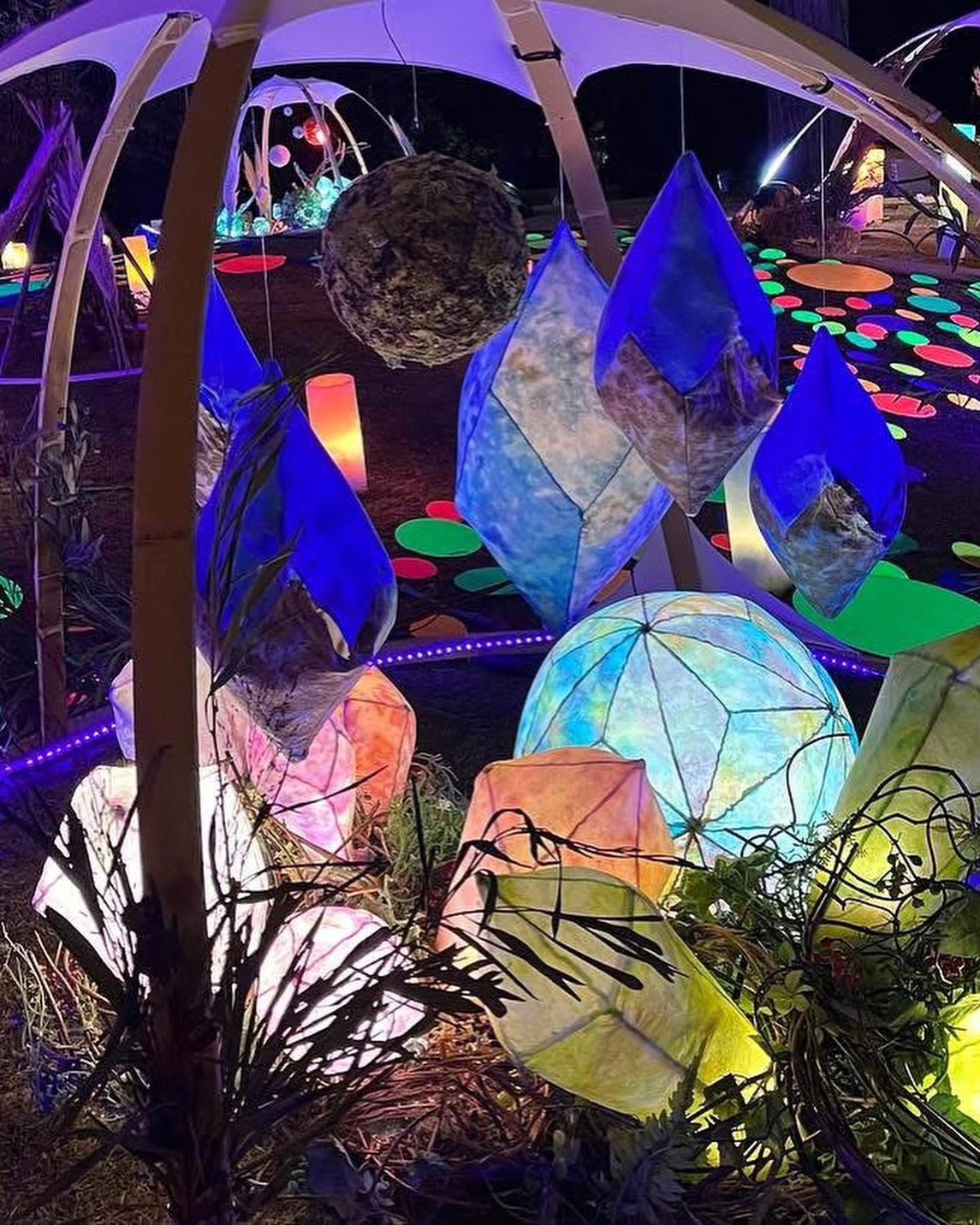 自作の「葉玉ランプ」「結晶ランプ」「幾何学ランプ」を軸に、自然素材と光を組み合わせることで、空間に“呼吸”と没入感をもたらす装飾を施す。