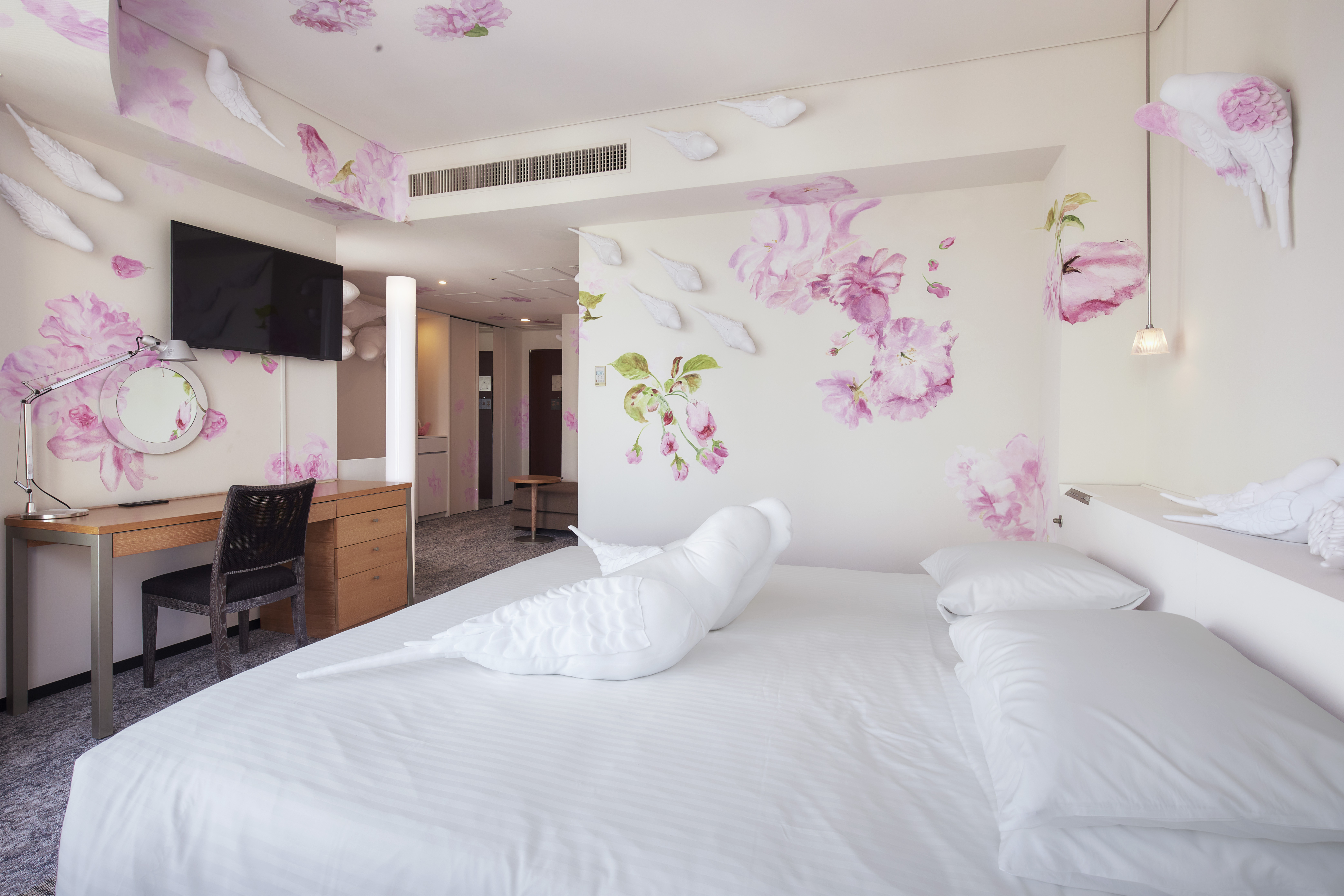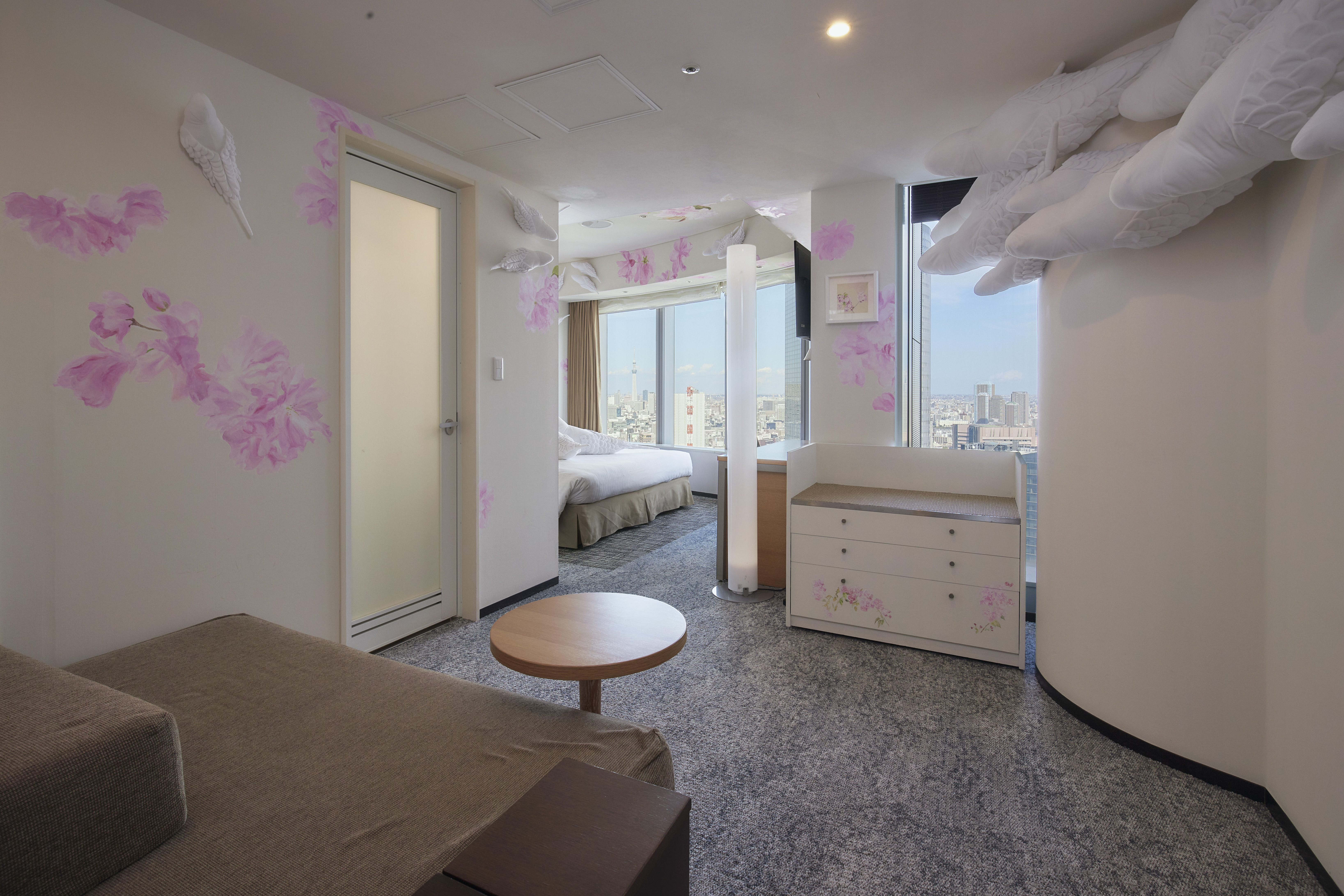 The 50th Artist Room, “Utopia in Japan,” is the first collaboration between painter Nagisa Nakauchi and sculptor Wakako Kawakami. The moment the door opens, guests see beautiful Yae-sakura (eight-fold cherry blossoms) in full bloom reaching up to the ceiling, and parakeets flying freely around the room. It feels as if the gentle spring sky surrounds the space, bringing a calm and peaceful feeling to the heart.