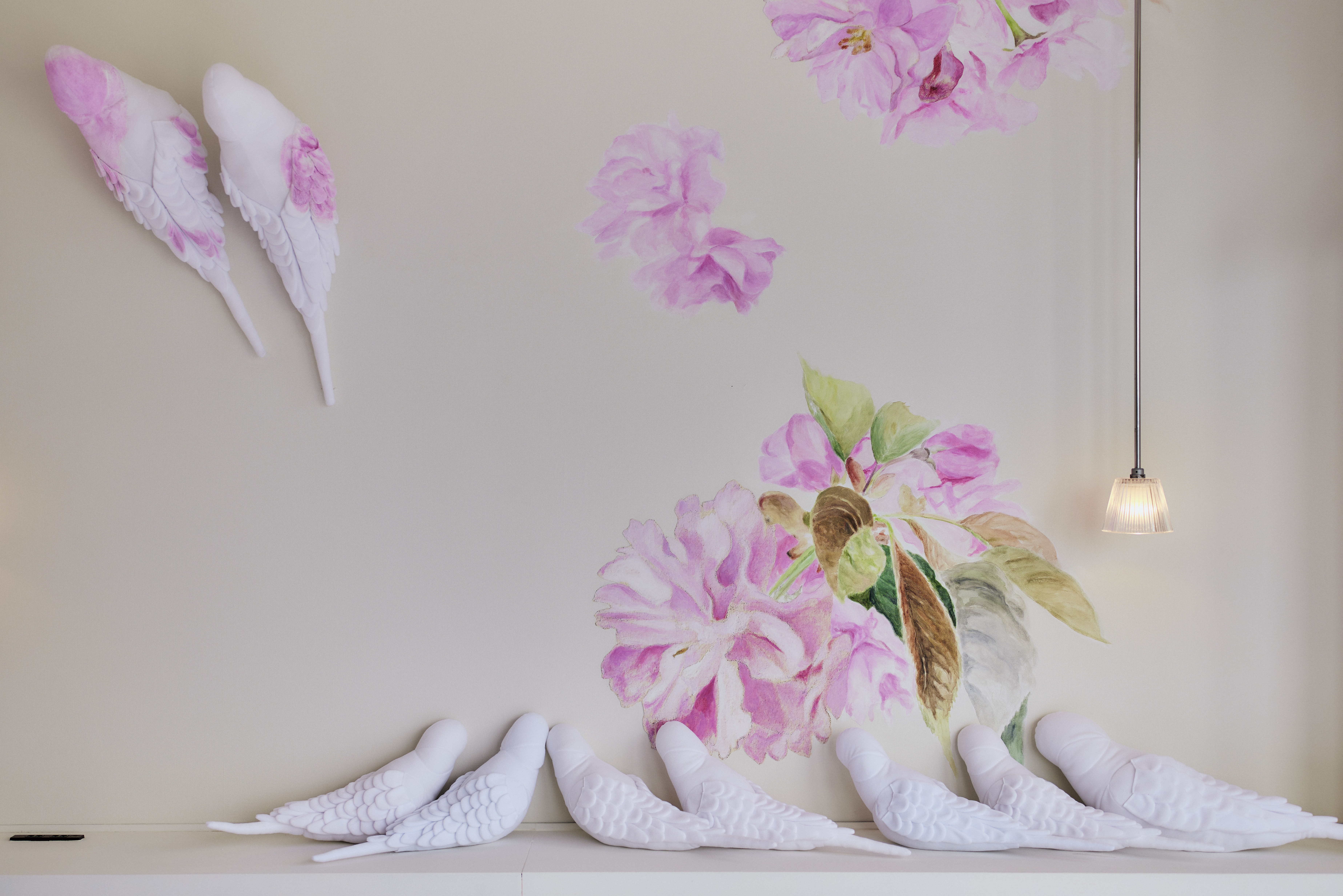 桜の絵とインコの立体が仲良く共存する、まるで理想郷のような客室には、日本の伝統的な美意識である花鳥のパワーがみなぎっています。訪れる人がこの世界観に身を委ね、今ある幸せにそっと思いを巡らせる——そんなひとときをお届けできることを願っています。