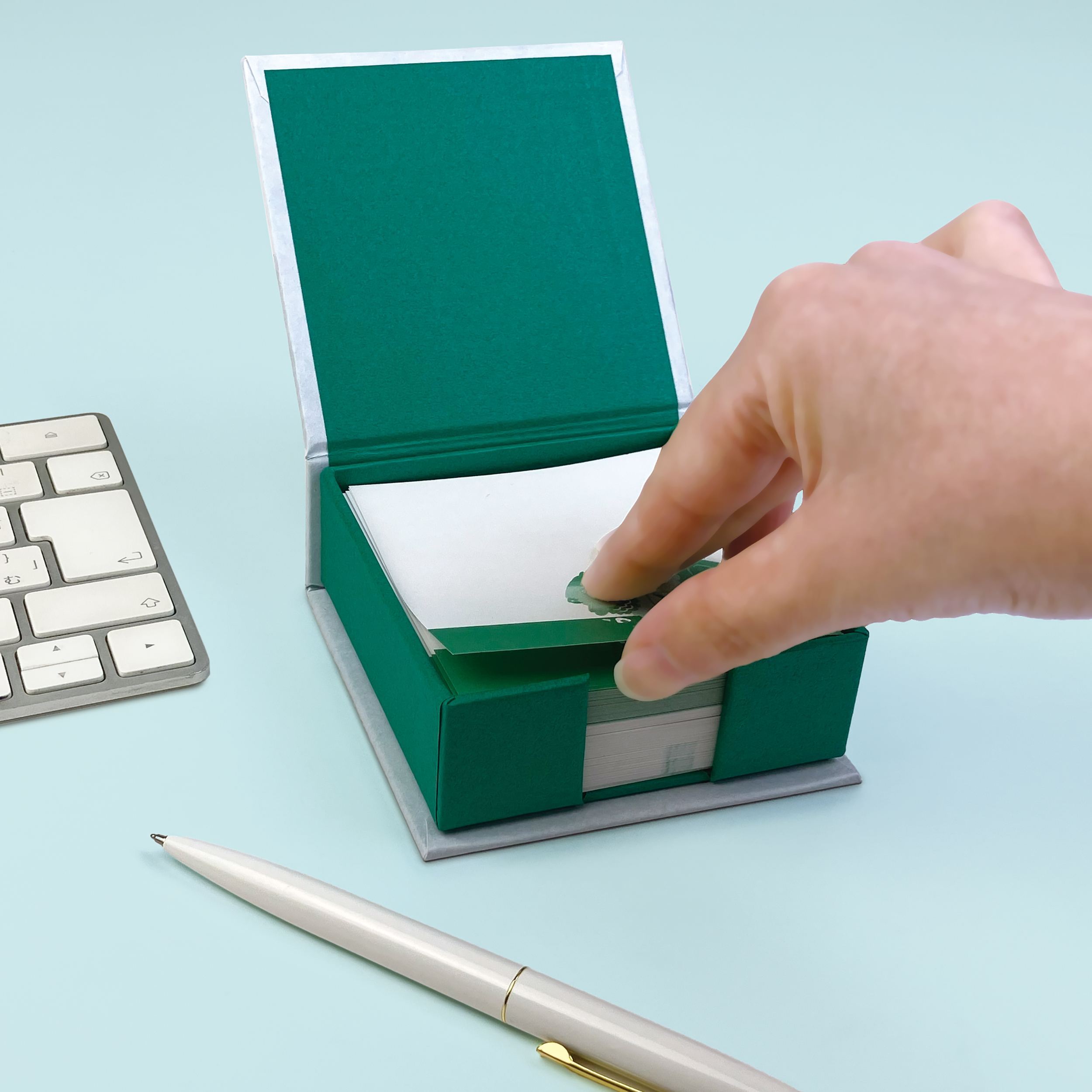 マグネット式のフタが「カチッ」と心地よく閉まるブック型ボックスです。前面の開口部からメモを取り出しやすく、最後の1枚までスムーズに使えます。メモを収納することで、日焼けやホコリから守り、デスクまわりをすっきりと整えることができます。