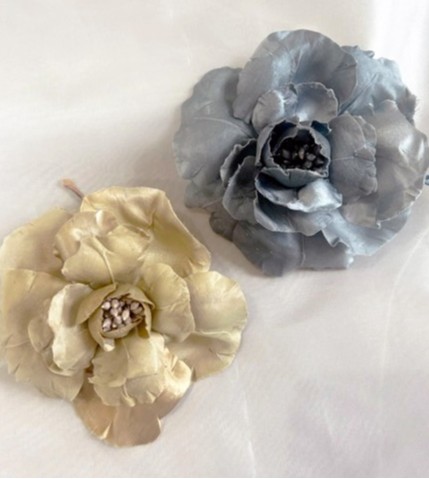 シルクを染めてコテを当て、本物のような質感に仕上げた「布花」。