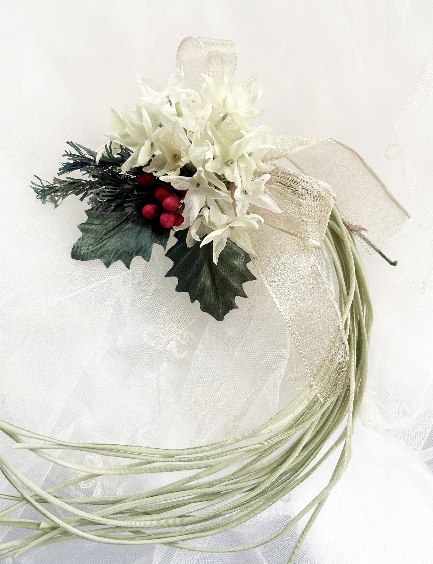 星形の白い小花にヒイラギとモミの葉を組み合わせ、冬らしい自然の彩りを感じるリースをお作りいただけます。