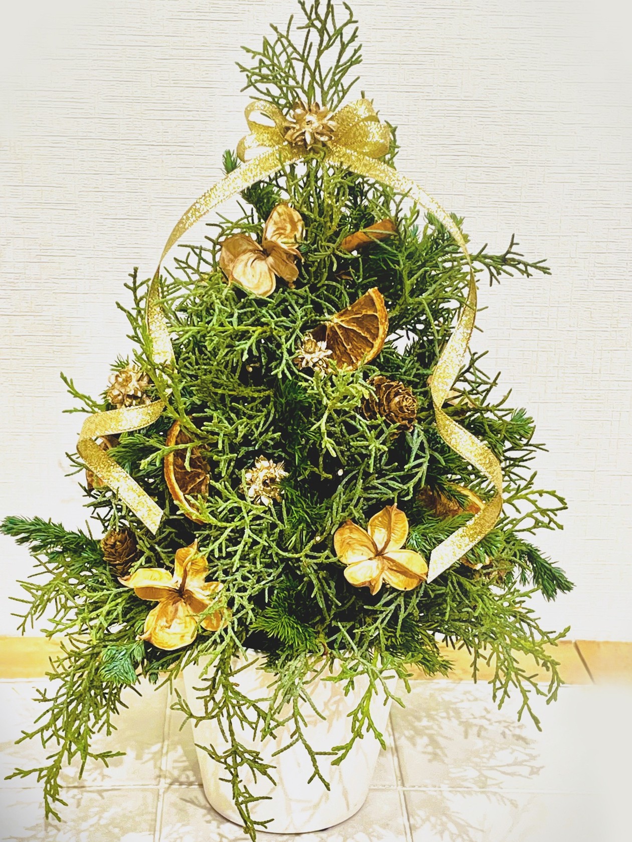 鮮やかな針葉樹のグリーンに、ドライフルーツやゴールドリボンをアクセントに取り入れたテーブルツリーです。クリスマスまでの期間、テーブルを華やかに彩り、季節感のある空間を生み出します。