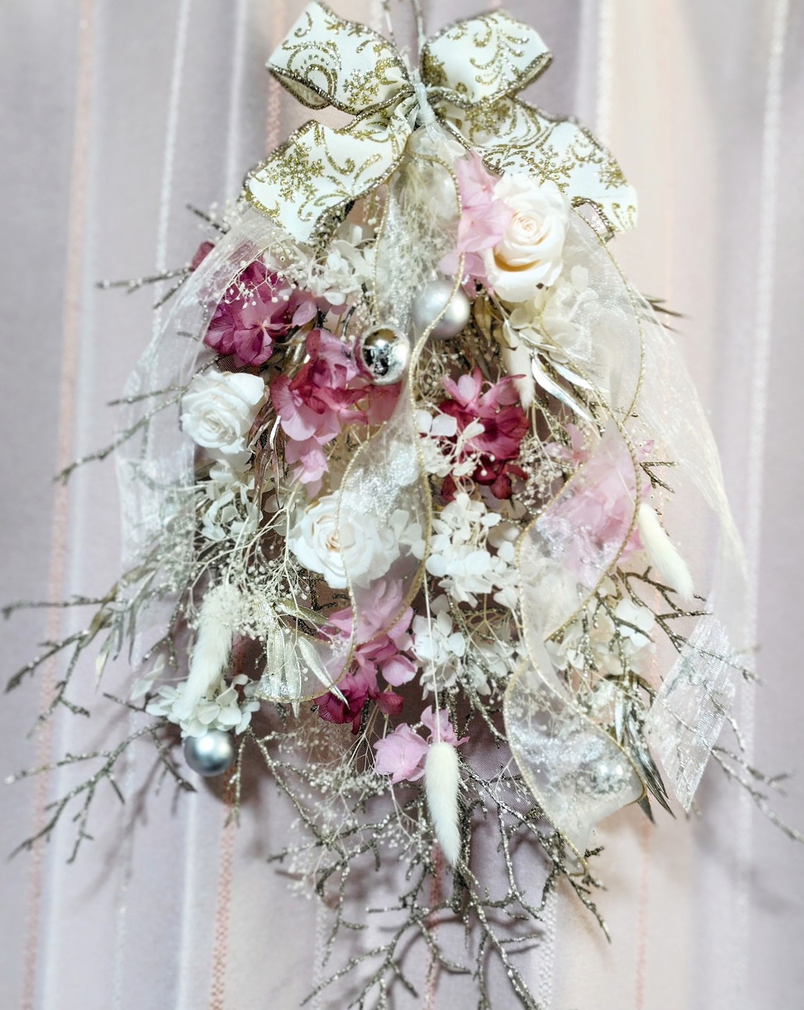 ふわふわとキラキラ輝く冬にぴったりのプリザーブドフラワーのクリスマススワッグ。シャンパンゴールドをベースに、ブルーまたはピンクの挿し色をお選びいただけます。