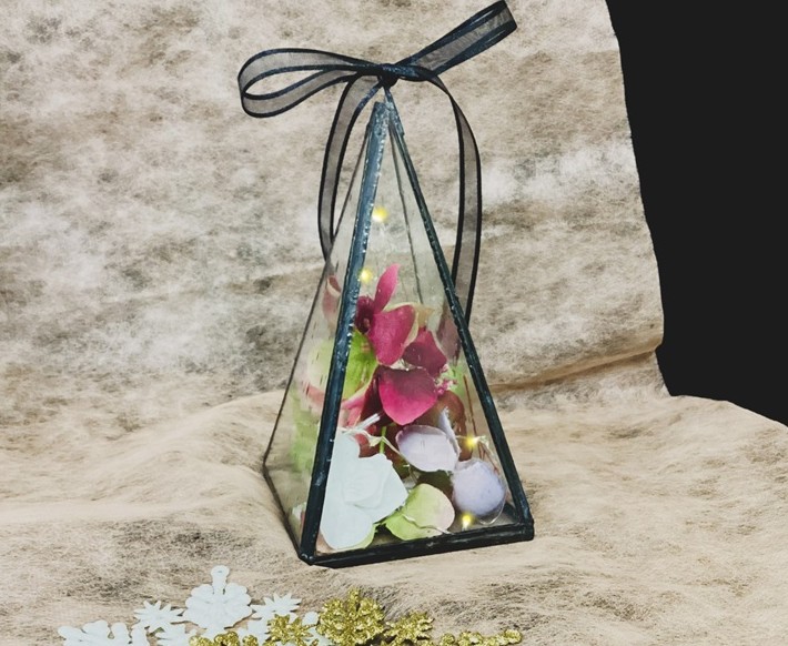 ピラミッド型のステンドグラスにイルミネーションや植物を入れ、世界にひとつだけのツリーを仕立てます。お好みの花や植物に差し替えができ、自分だけのデザインをお楽しみいただけます。