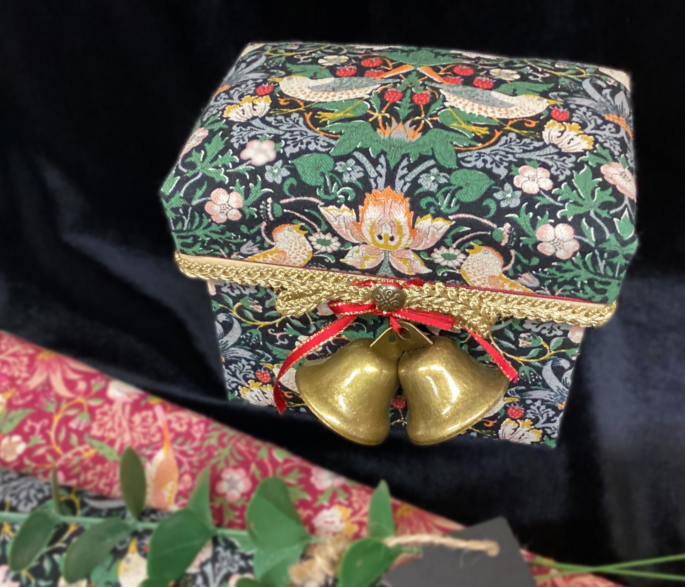 ウィリアム・モリスなどの生地を活かし、クリスマスデコレーションを施したミニ茶箱です。ベルの飾りはシンプルなものにも変更でき、ディッシュクロスやグリーンと合わせて、食卓を華やかに彩ります。