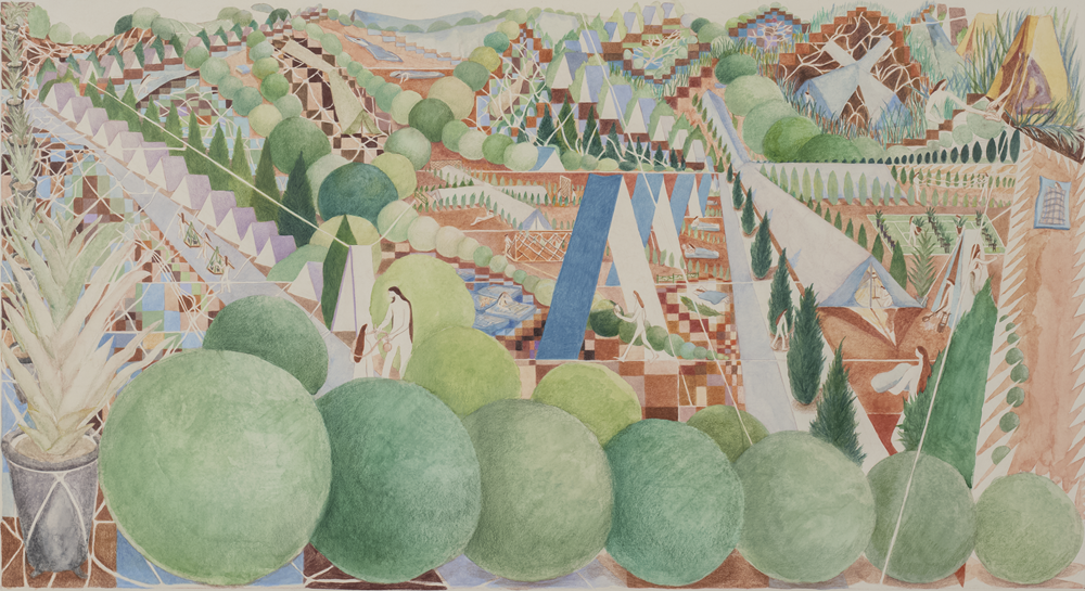 東山詩織は、人と人や環境との間にある境界線に関心を寄せ、水彩や色鉛筆の緑や茶を基調とした柔らかな色合いで絵を描いている。丸型や三角形の植栽や斜め格子の生垣は街を区分けし、そこに置かれた三角形のテントや四角い布団は人々が憩える空間を用意する。東山が描き出すパブリックとプライベートに跨る境界は、関係性を遮断するのではなく、他者や人工物と適切な距離を取るための緩衝材やつなぎとしてある。画面全体をグリッド状に分割する幾何学パターンのような構図は、陣形図やスポーツのフォーメーションから来ているといい、身体や心の守りの型を意味している。図柄の反復による装飾性と人物が想起させる物語性、また奥行きと平坦性が同居する絵画は、白昼夢のような非日常性のなかに、誰にとっても必要なセーファースペースを設けている。都市の境界といえるフェンスに展開される、異なる時空間とスケールが組み合わされた絵の所々には、かつての江戸城の構図や呉服橋の構造、着物柄など、この地に繋がる要素が織り込まれている。(東京オペラシティアートギャラリー シニアキュレーター 能勢陽子)