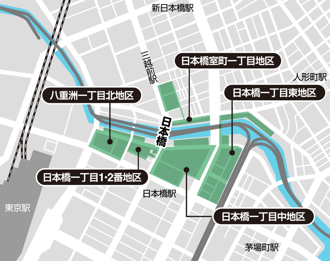 日本橋一丁目中地区市街地再開発組合、八重洲一丁目北地区市街地再開発組合、日本橋室町一丁目地区市街地再開発組合、日本橋一丁目東地区市街地再開発組合、日本橋一丁目1・2番地区市街地再開発組合