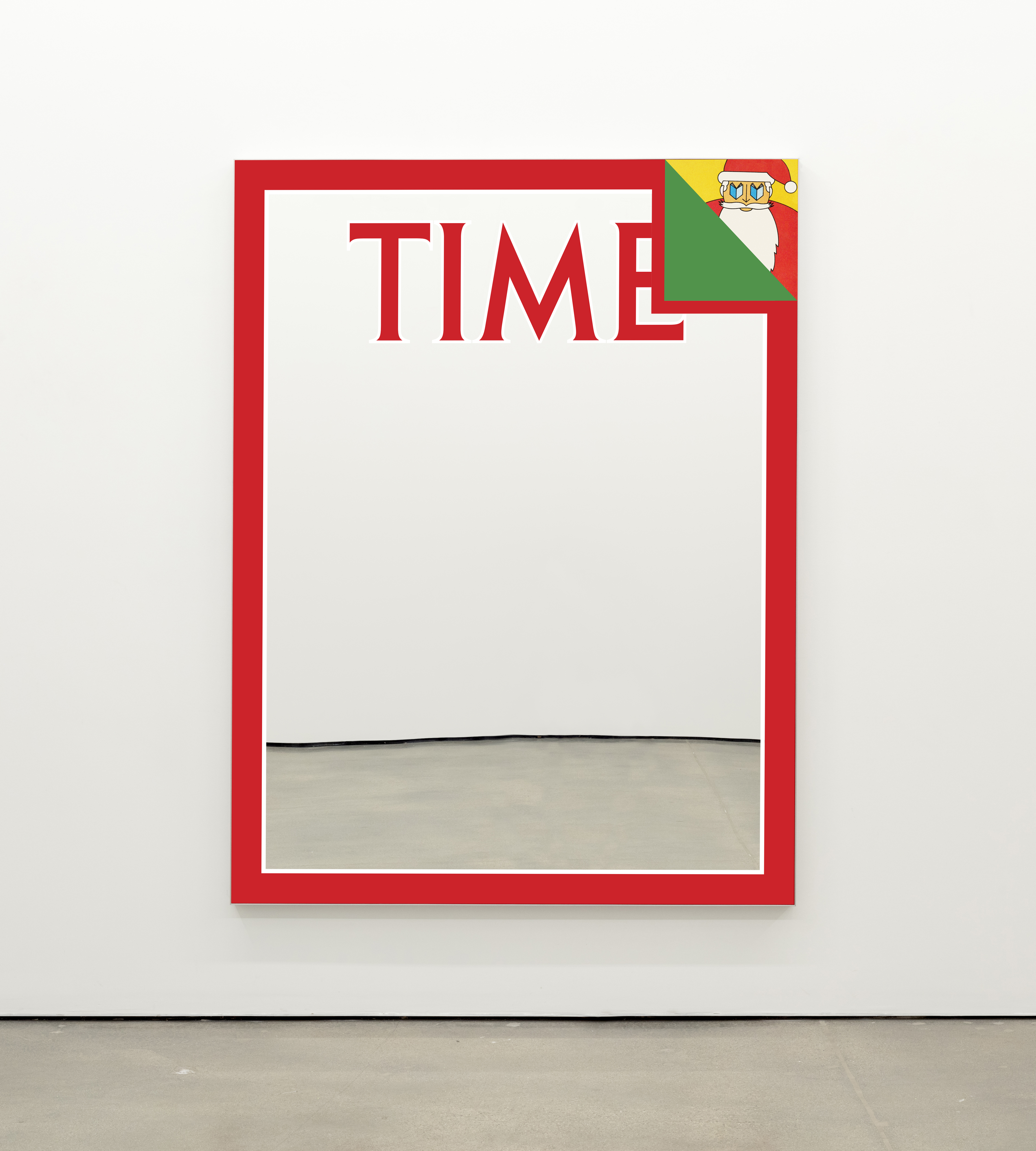 中核を成すのは、代表作「TIMEミラー」シリーズのホリデー仕様の新作。等身大の鏡にアイコニックな赤いフレームやロゴ的なグラフィックを配することで、鏡が持つ「自己の反映」とメディアが切り取る「時刻/出来事」のフレーミングを重ね合わせ、鑑賞者に時間性と自己認識の重なりを視覚的に提示します。