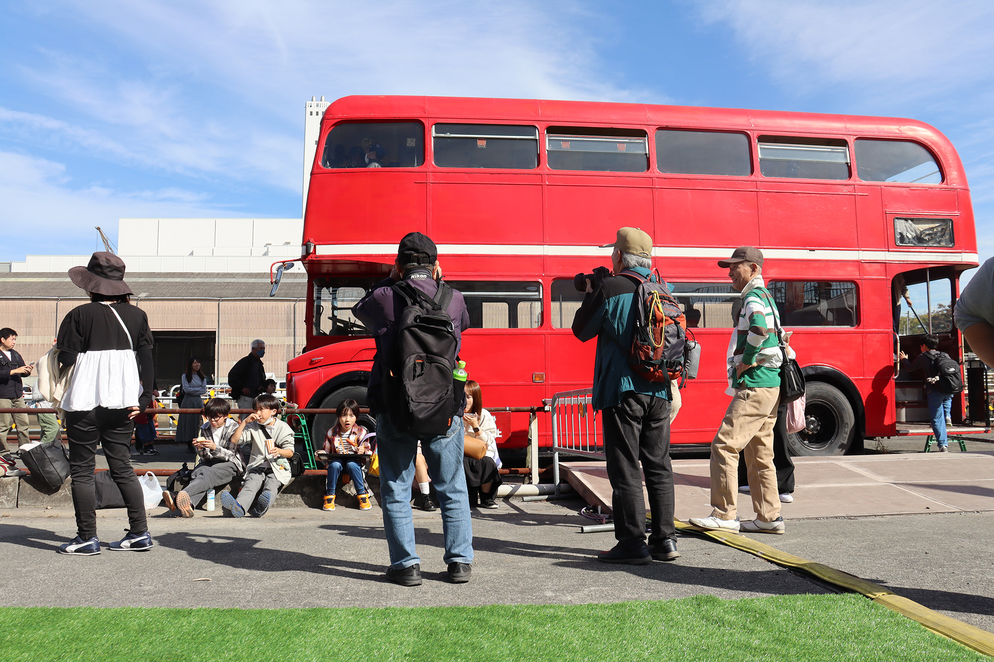 造船所の倉庫をバックに、真っ赤なロンドンバスが今年も登場します。車内にも入ることができます。