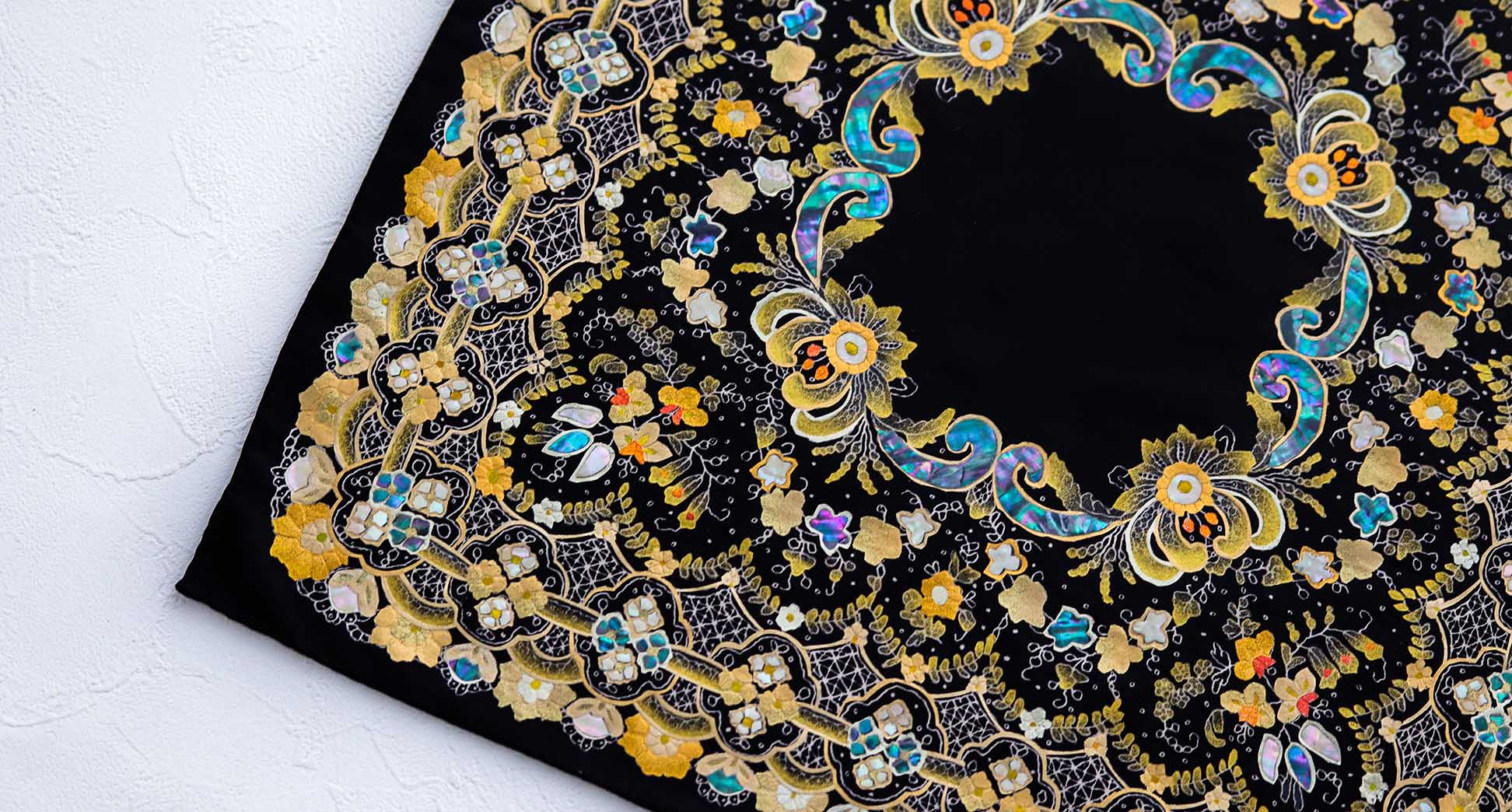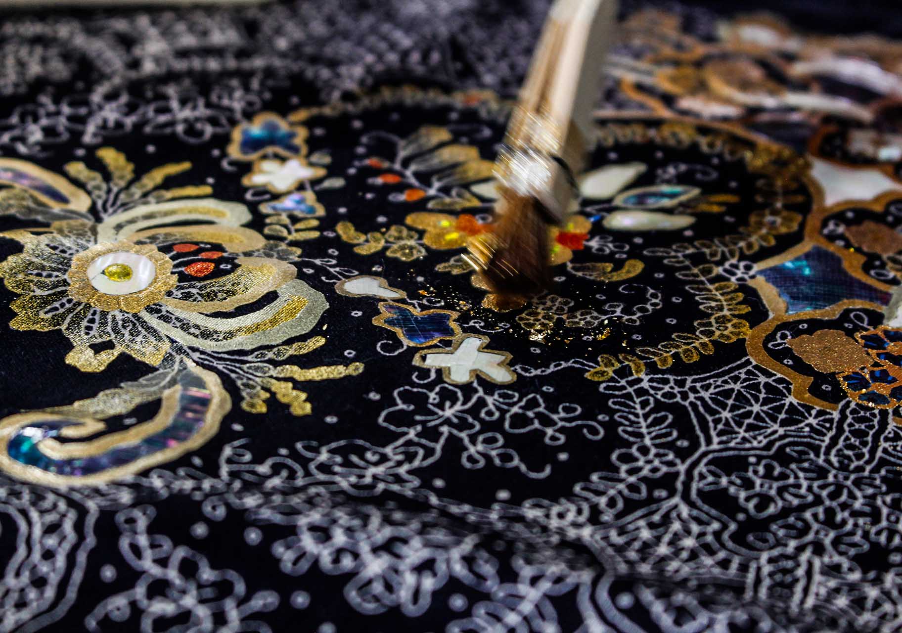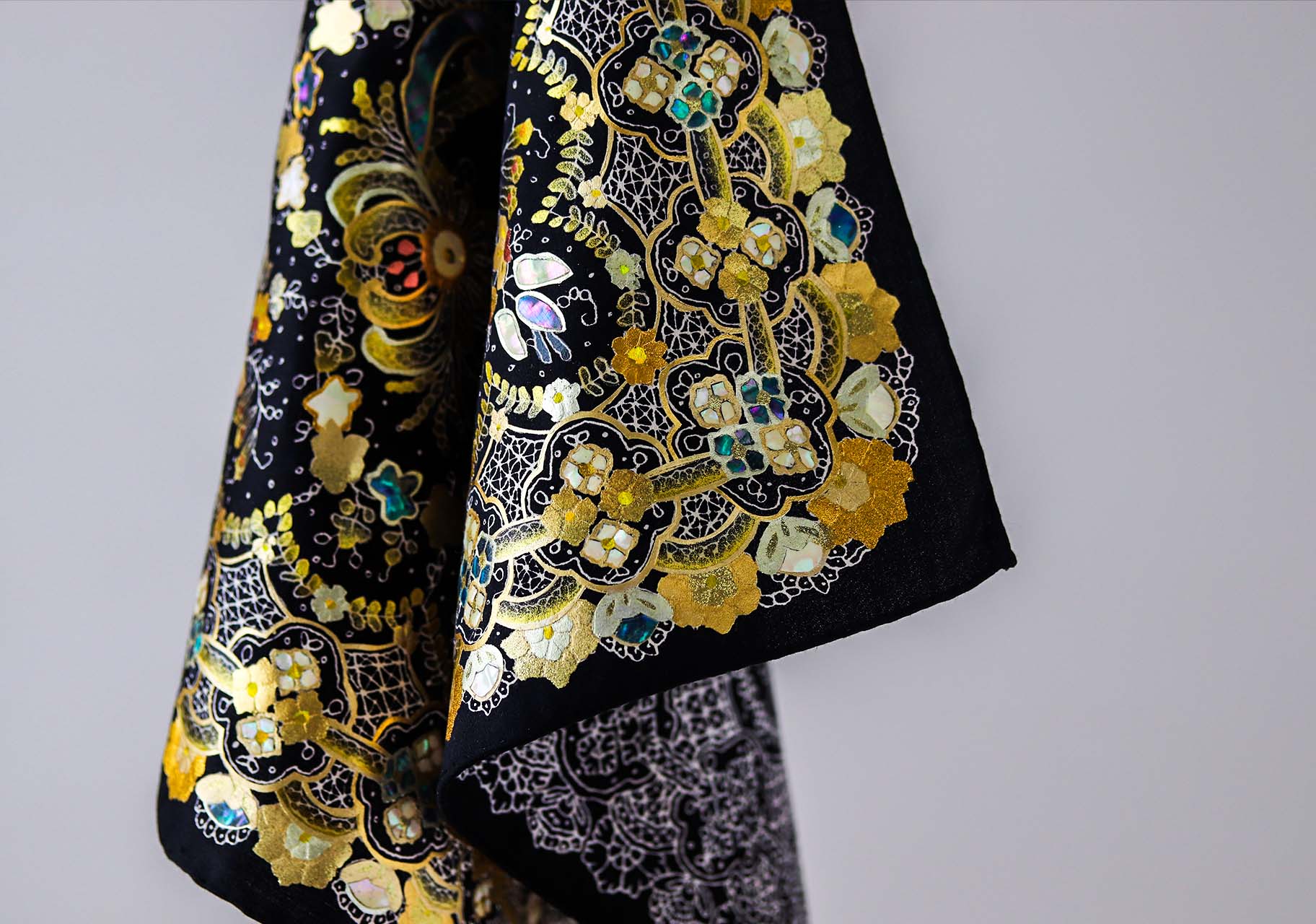 現在は着物を超えた新たなモノづくりにも挑戦を続けており、本作では金彩と螺鈿の加飾を一点ずつ手仕事で仕上げました。