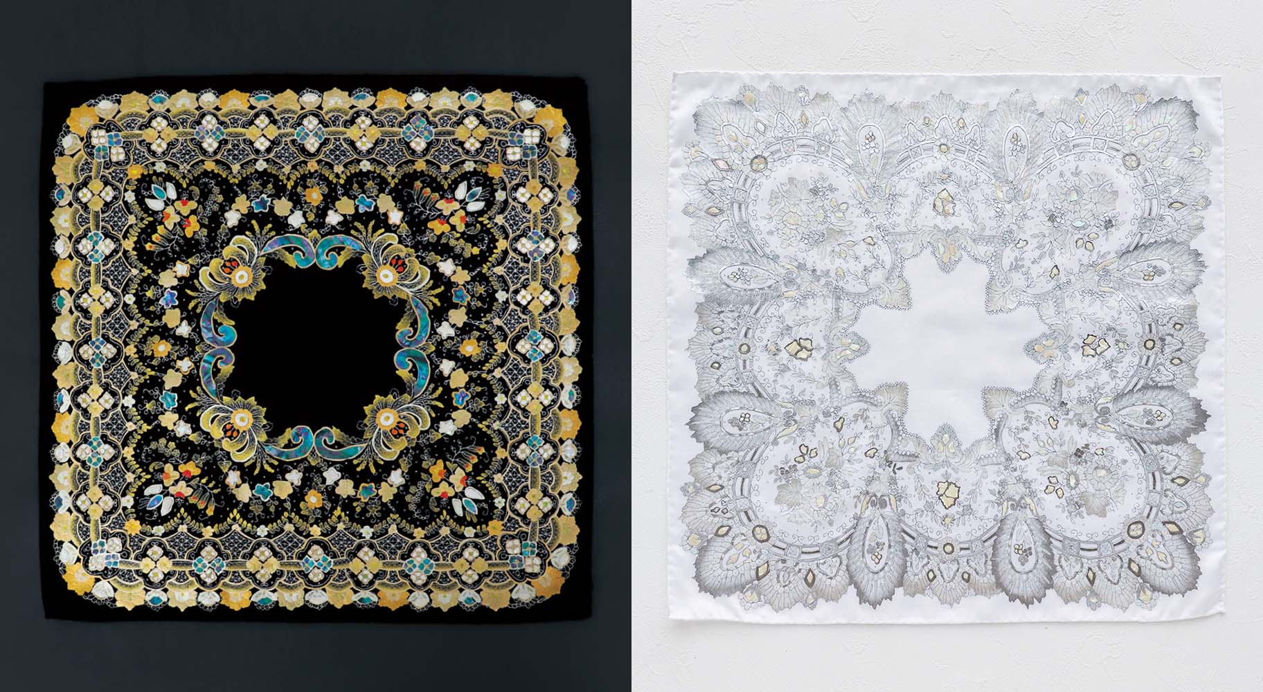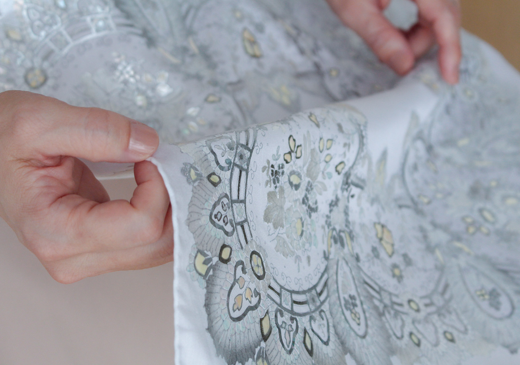貝を削り装飾にする螺鈿は、本来ハンカチーフのような柔らかな素材には施すことが難しく、門外不出の独自技術によって実現しています。